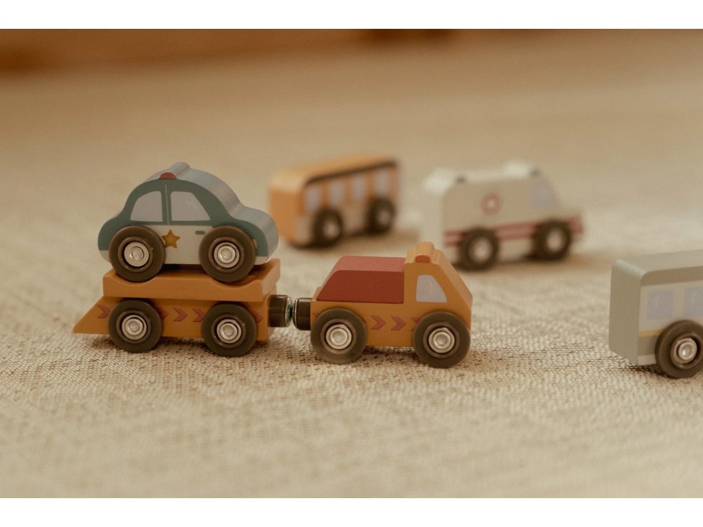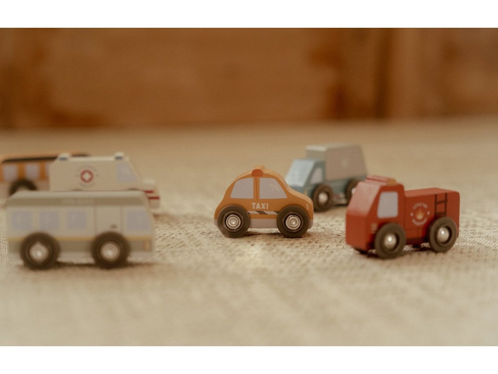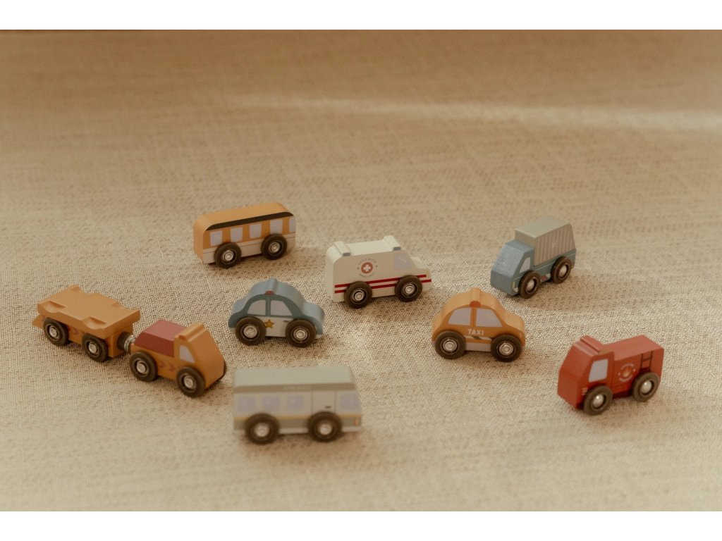 Město je pořád v pohybu! Tato sada dřevěných vozidel různých profesí je připravena vyrazit do akce a pomáhat tam, kde je třeba. Hasičské auto vyjíždí k požáru, policejní vůz hlídkuje po městě a nákladní auto dováží zásoby – každý den přináší nové dobrodružství.