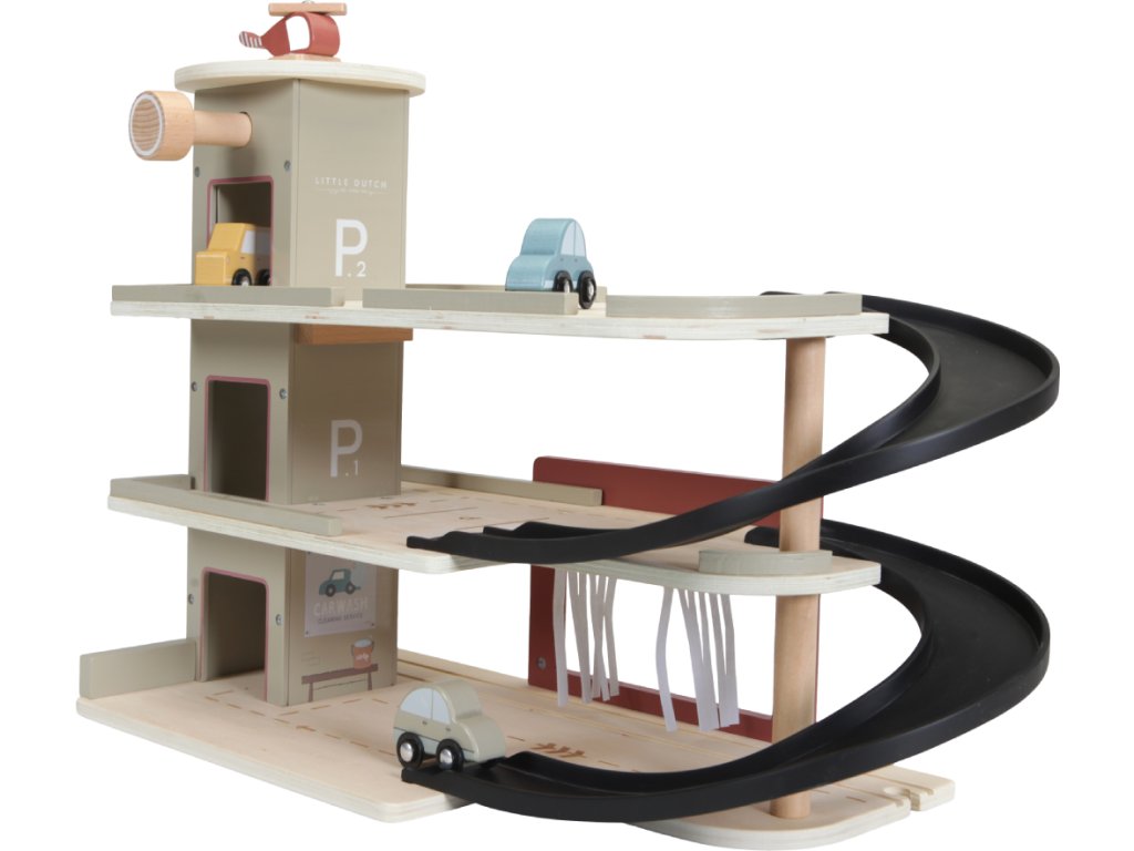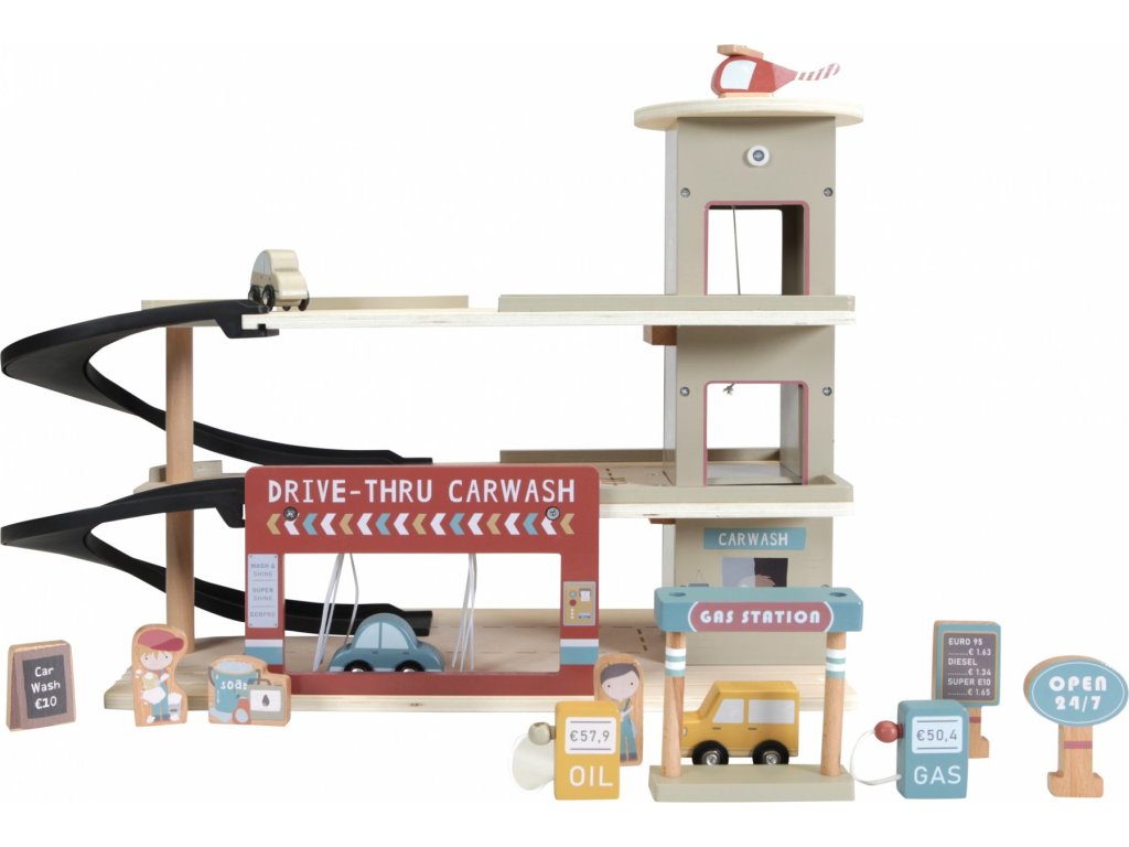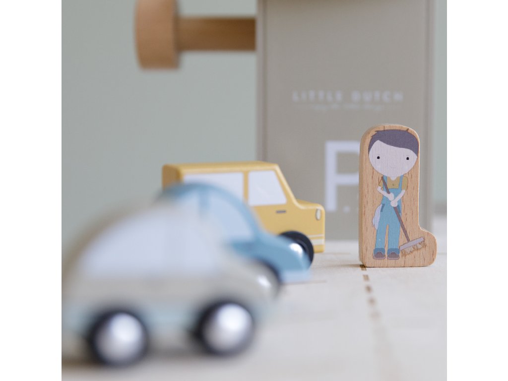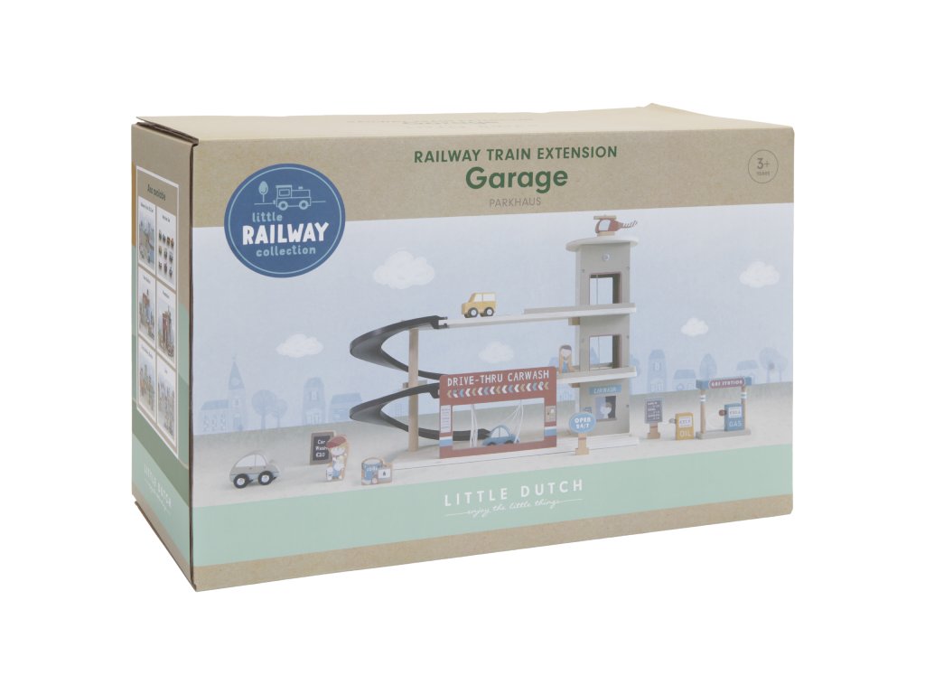 Zastavte se v garáži, abyste natankovali benzín, zaparkovali auto nebo jej nechali vyčistit v myčce. Dřevěná garáž je jednou z mnoha herních sad, které lze připojit k dřevěné Little Dutch Vláčkodráze XXL. Garáž má přistávací plochu pro vrtulník. Dřevěné figurky jsou krásně ilustrovány po obou stranách a je možné je umístit do vagonů. Dřevěné kolejnice nejsou součástí setu.