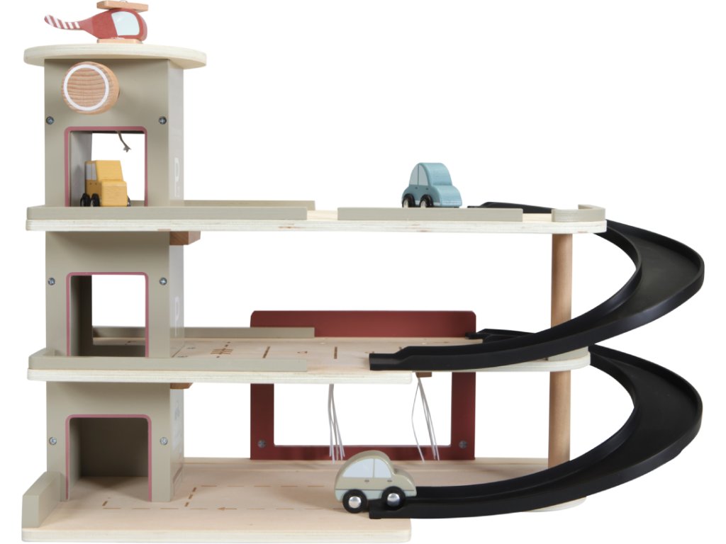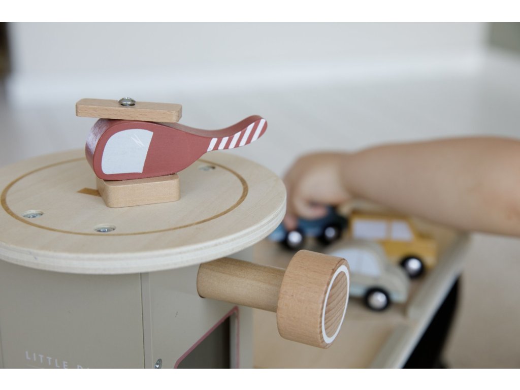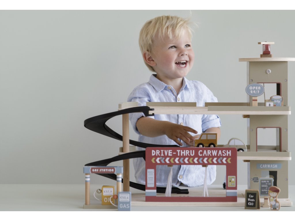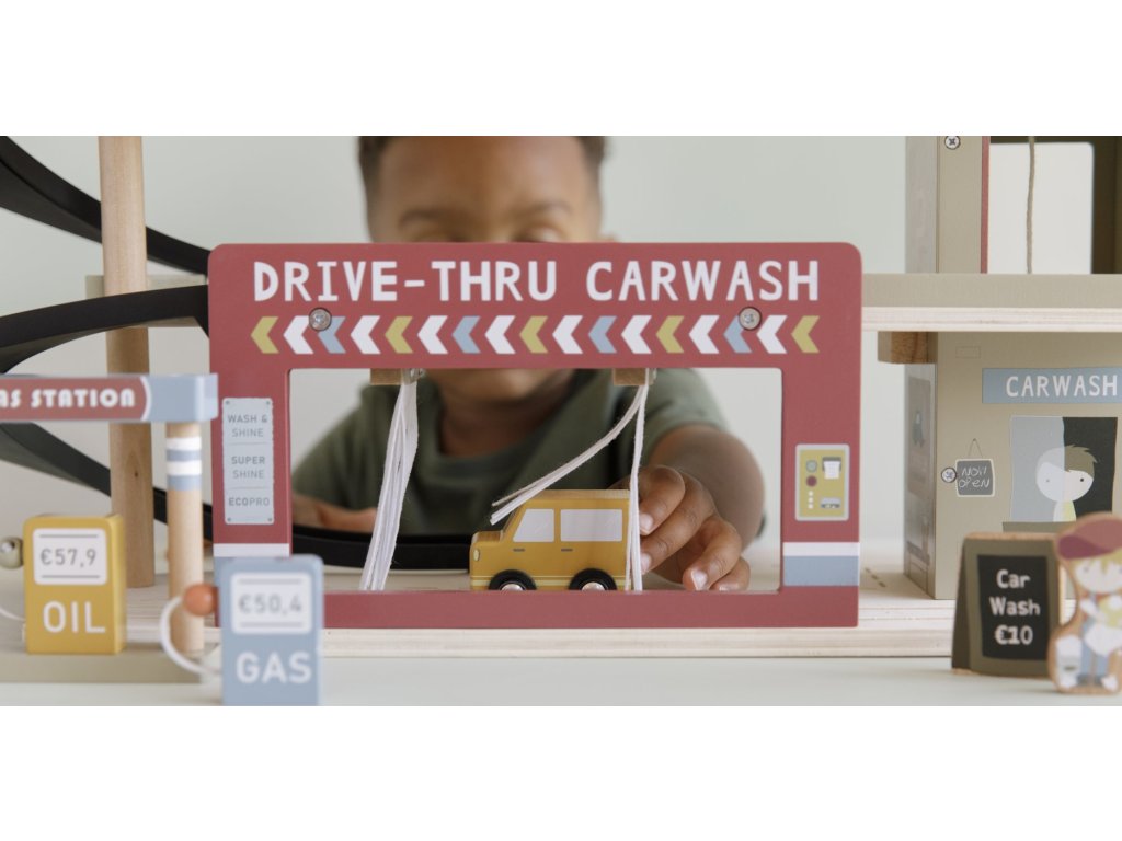 Zastavte se v garáži, abyste natankovali benzín, zaparkovali auto nebo jej nechali vyčistit v myčce. Dřevěná garáž je jednou z mnoha herních sad, které lze připojit k dřevěné Little Dutch Vláčkodráze XXL. Garáž má přistávací plochu pro vrtulník. Dřevěné figurky jsou krásně ilustrovány po obou stranách a je možné je umístit do vagonů. Dřevěné kolejnice nejsou součástí setu.
