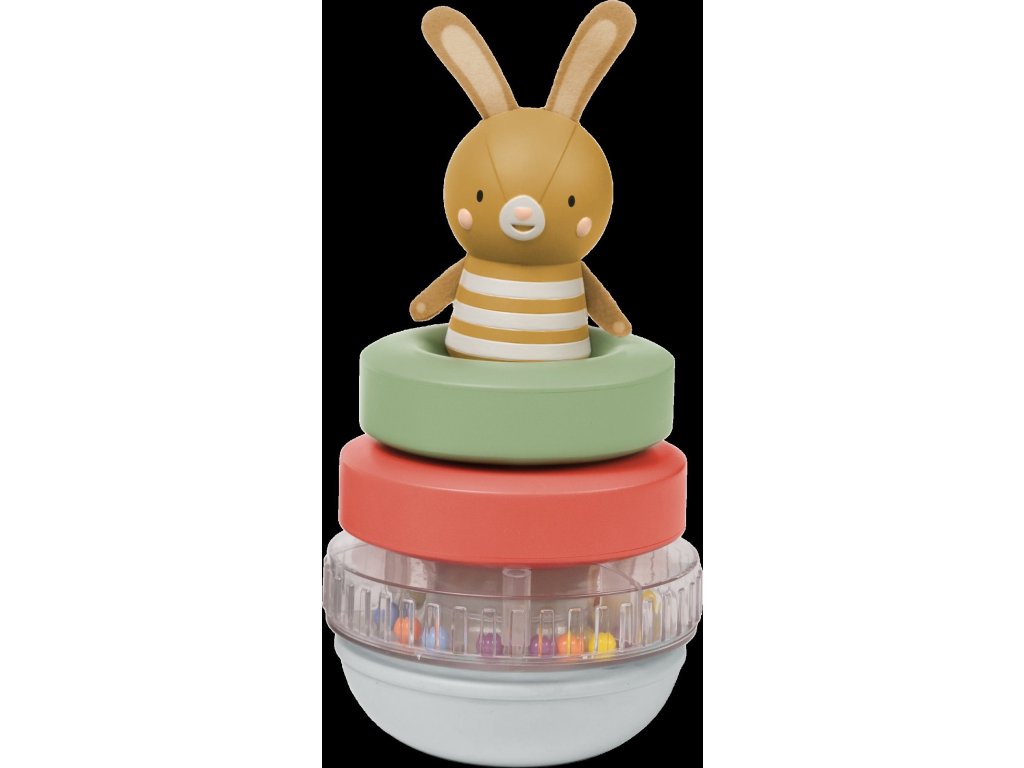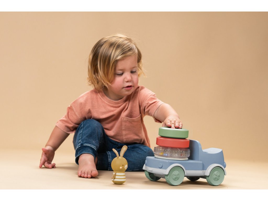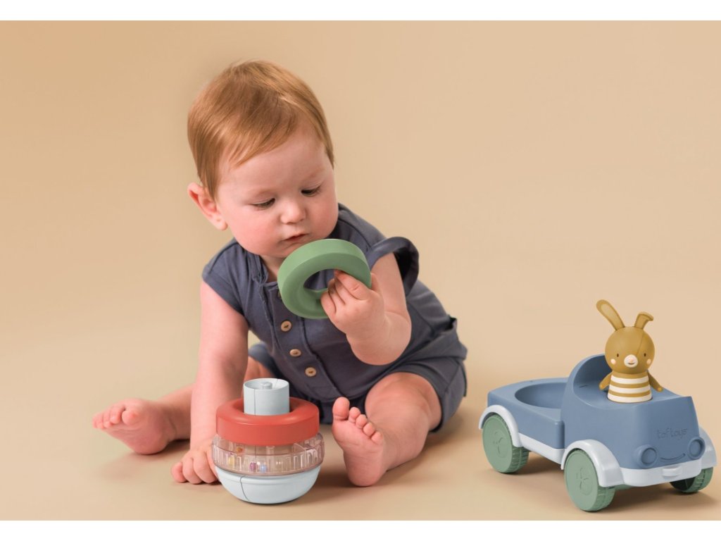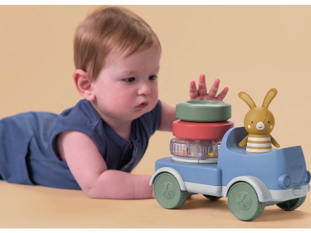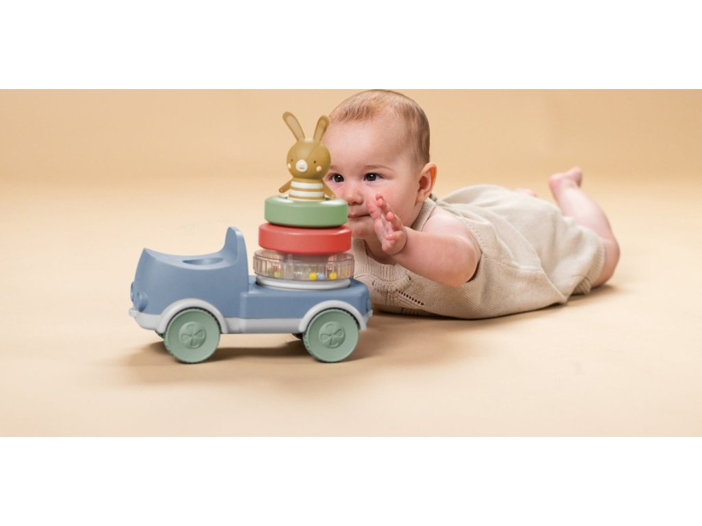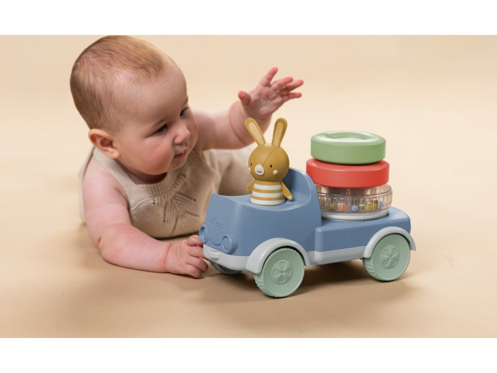 Náklaďák se zajíčkem a pyramidou z kroužků zaujme a zabaví vaše dítě, zatímco stimuluje jeho smysly a podporuje rozvoj jemné motoriky. Díky stohování kroužků se dítě učí zlepšovat koordinaci rukou a očí. Při jízdě se pyramida otáčí a vydává veselý chrastivý zvuk, který podněcuje malé objevitele k pohybu a plazení.