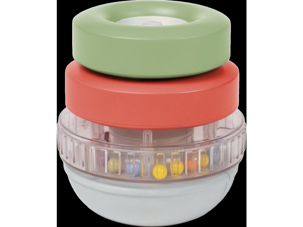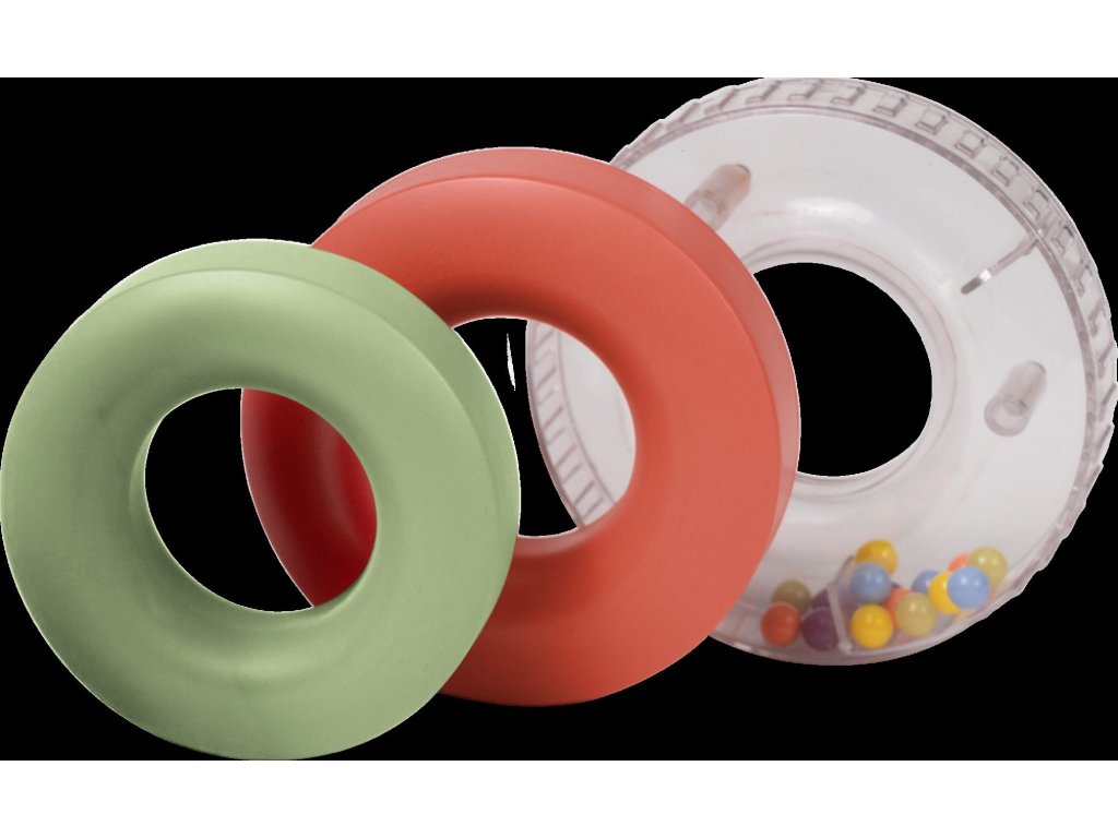 - Multismyslový zážitek: Tři barevné kroužky různých velikostí s poutavými prvky. Ploché kroužky mohou stát i kutálet se po zemi, což přináší další radost při hře.