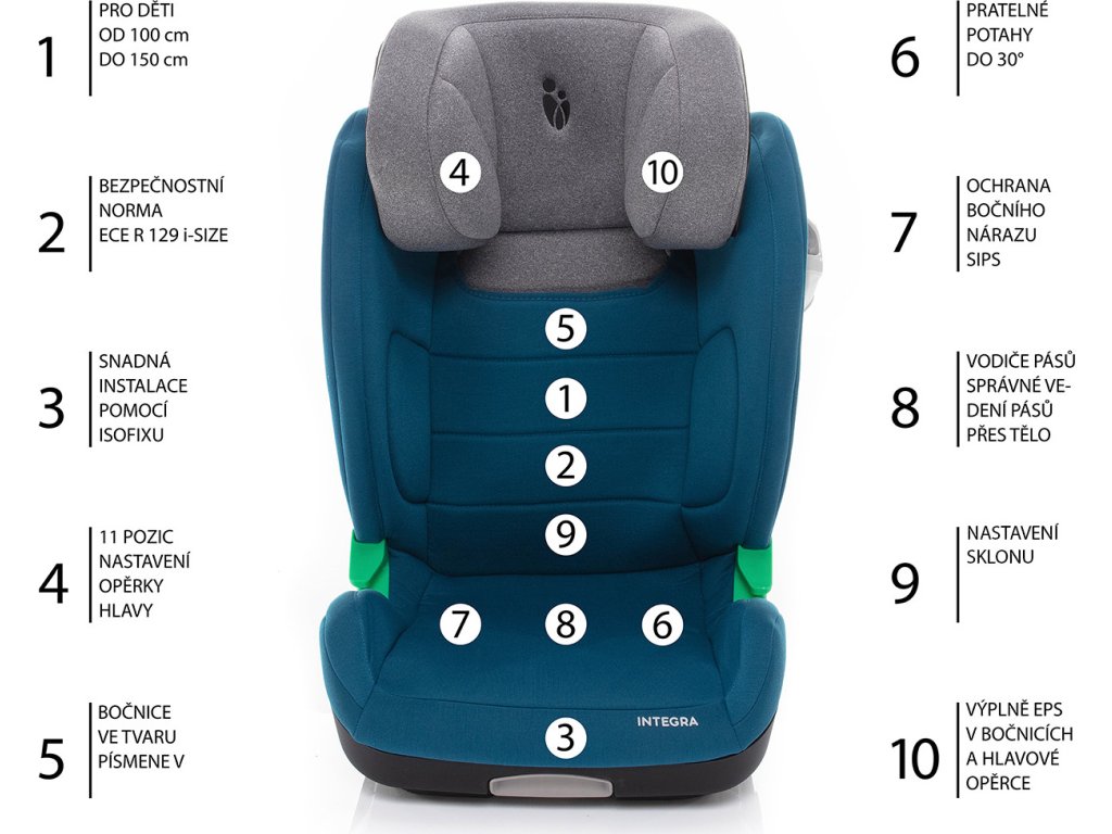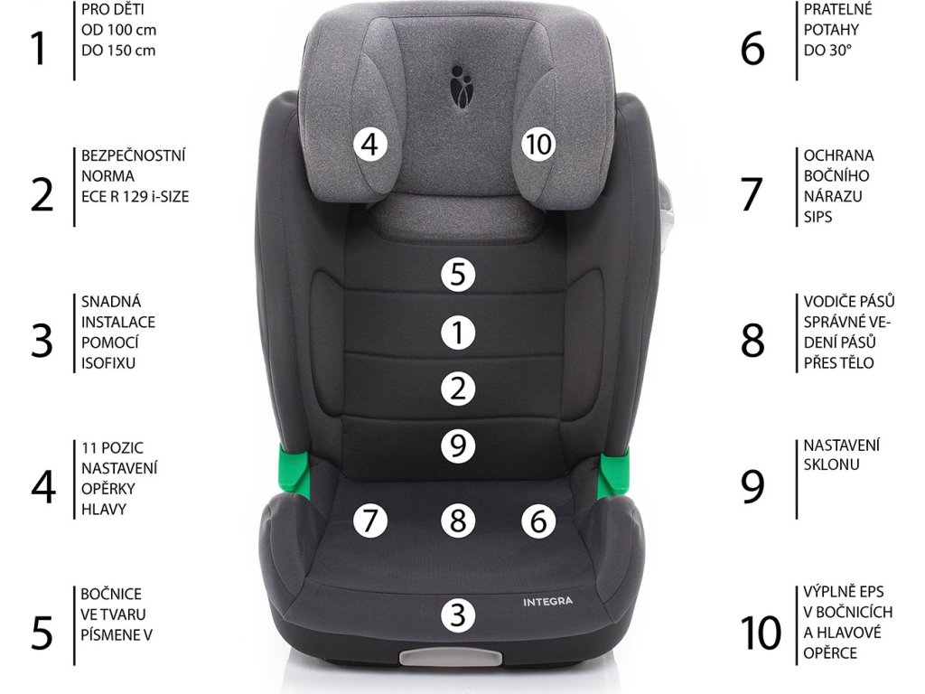 Autosedačka Integra i-Size splňuje požadavky té nejpřísnější bezpečnostní normy a poskytuje nekompromisní ochranu dětem až do výšky 150 cm. Při jejím vývoji jsme se zaměřili nejen na absolutní bezpečí, ale i na pohodlí malých pasažérů. Proto je Integra i-Size vybavena jedinečným 4pozičním polohováním. Díky němu bude cestování dítěte, zvláště v případě spánku, daleko pohodlnější.