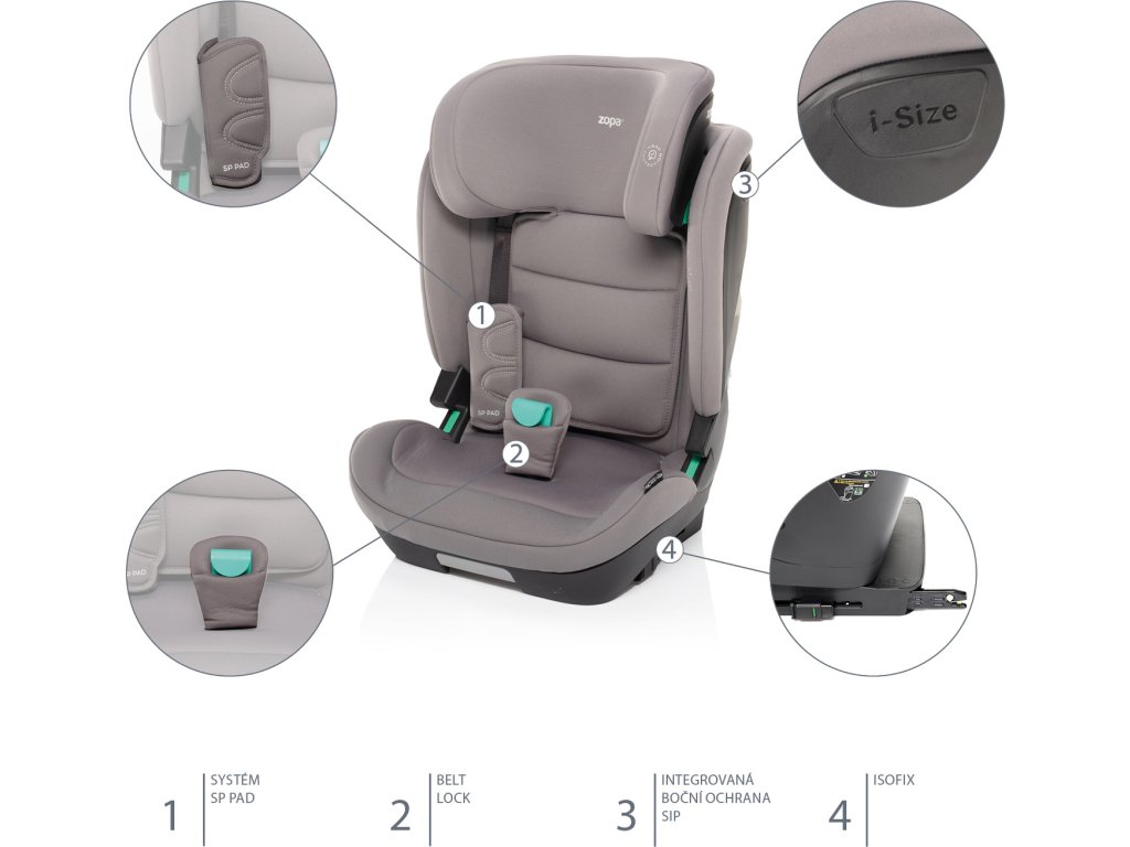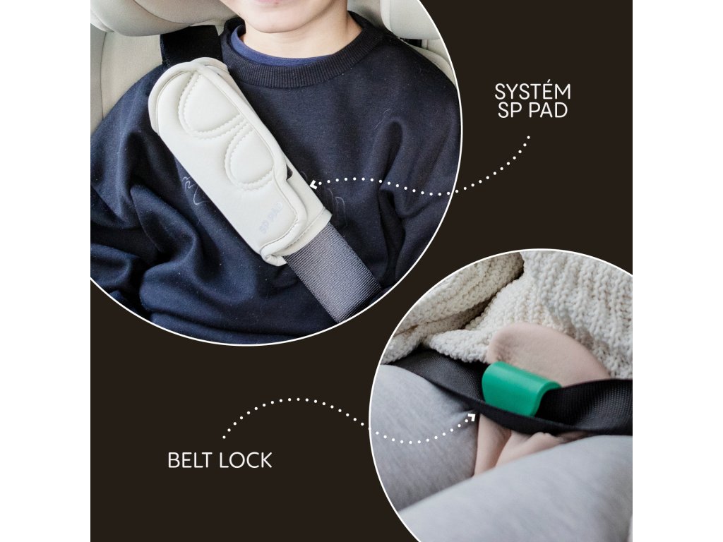 Pro případ čelního nárazu je autosedačka vybavena SP PAD, které redukují zatížení hlavičky, krční páteře a hrudníku. Funkce Belt Lock přidává 4 bod při poutání a při čelním nárazu tak snižuje tlak na bříško dítěte. Integrovaná boční ochrana SIP po celé délce chrání dítě i ve spodní části. Splnění nejnovější normy i-SIZE garantuje bezpečí po celou dobu používání.