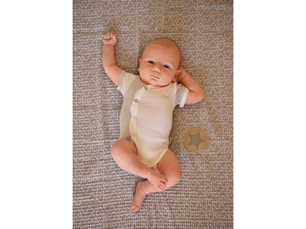 Body s krátkám rukávem z tenkého bavlněného úpletu s materiálem Outlast® je jemné, pružné a velmi příjemné na dotek. Díky pružnosti krásně přiléhá na tělíčko a nikde neodstává. U krčku se zapíná na jeden patent. Outlast® vytváří ideální teplotní podmínky a udržuje stálou teplotu mezi pokožkou a tkaninou, proto když se teplota zvýší, ať už díky rychlému pohybu či zvýšením okolní teploty, Outlast® teplo odebere dřív, než se pokožka začne potit. V případě ochlazení, Outlast® tělu naopak teplotu dodá. Materiál je velmi vhodný pro děti s problematickou pokožkou, ať už se jedná o alergiky, či děti s atopickým ekzémem. Nevyvolává alergické reakce a je inertní vůči plísním a bakteriím, snižuje riziko vzniku potniček. Bodýčko je vhodné jak do horkého, tak i do proměnlivého počasí.