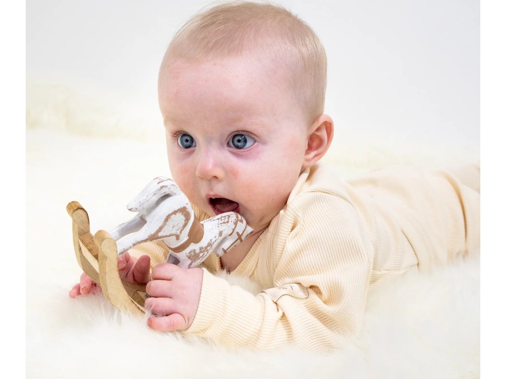 Rostoucí provedení bodyčka díky chytrému řešení pro zvětšení velikosti s dlouhými náplety na rukávech a dvěma řadami druků (patentků) v rozkroku vždy povyroste o jednu velikost s vaším miminkem. Designová nášivka na rukávu každého bodyčka.