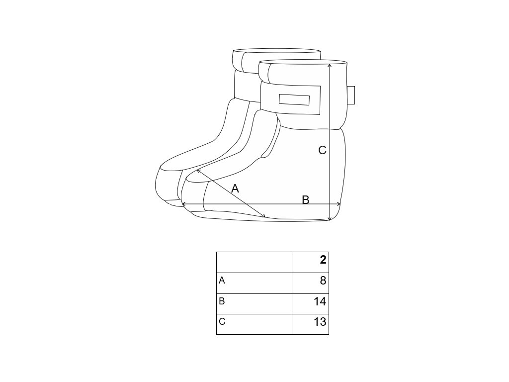 vel. 2 – 8 cm (šířka chodidla), 14 cm (délka chodidla), 13 cm (výška bačkorky)