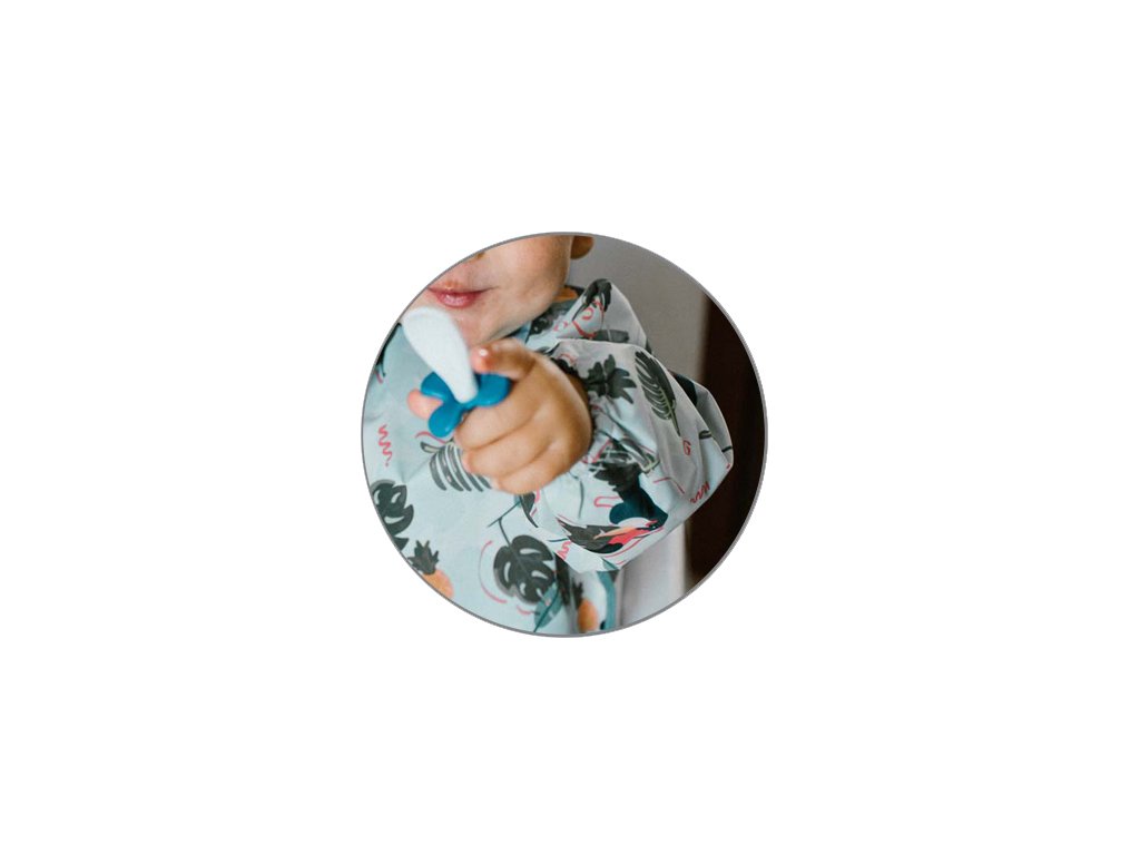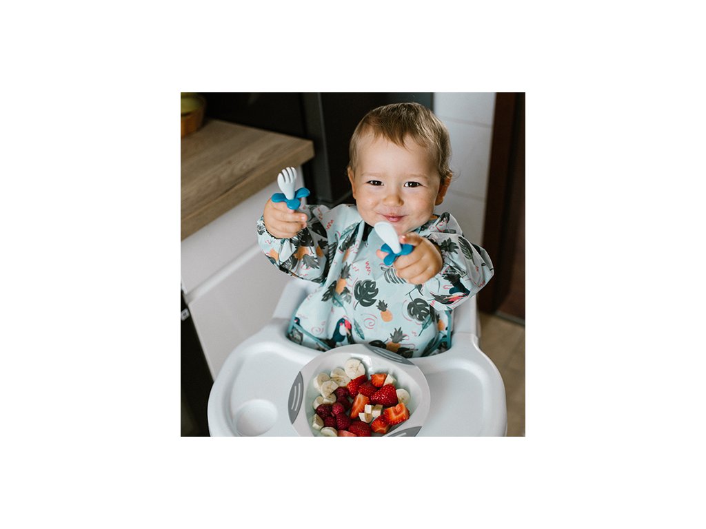 Díky pružným gumičkám na rukávech zástěra ještě lépe chrání dětské oblečení před nečistotami. Snadno se přizpůsobí malým ručičkám miminka.
