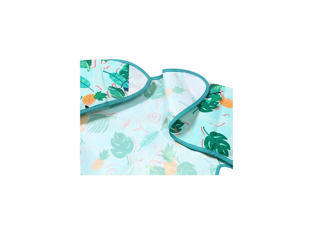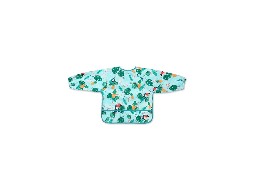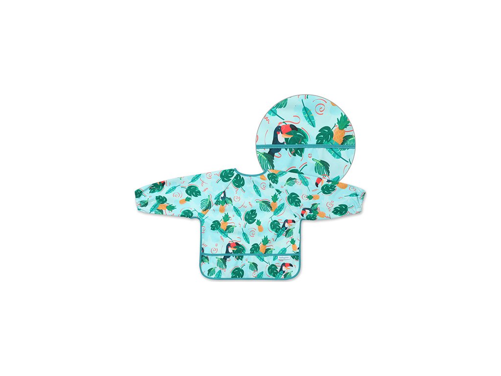 Bryndák s dlouhým rukávem je chytrý pomocník, který ochrání oblečení Vašeho miminka. Během jídla zajišťuje přední část oblečení i rukávy, které se zvyknou ušpinit. Díky pružným gumičkám dobře přilne k malým ručičkám miminka. Bryndák s rukávy má také praktickou kapsu na drobky, která zachycuje zbytky jídla. Zástěra s rukávy je voděodolná a snadno se čistí, takže se osvědčí, když se děťátko učí jíst samo. Zapínání bryndáku můžete libovolně přizpůsobit velikosti krku miminka.