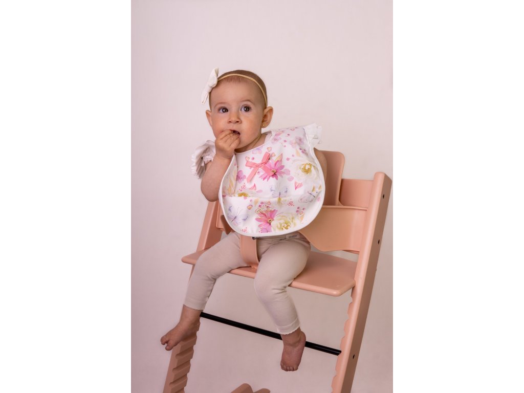Široký úchyt pokrývá hrudníček i ramena a kapsa zachytí všechny drobky, či tekutiny malého jedlíka.