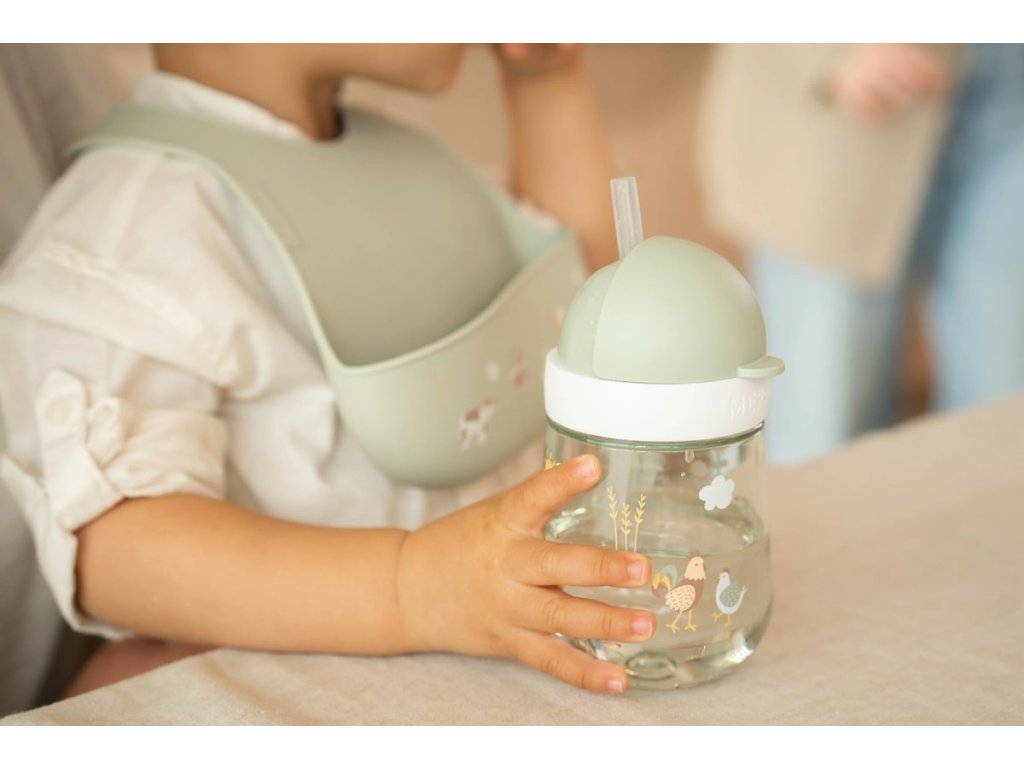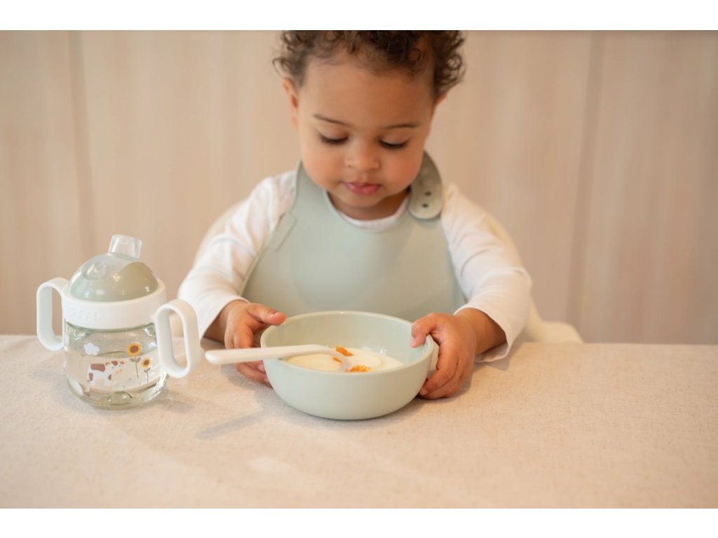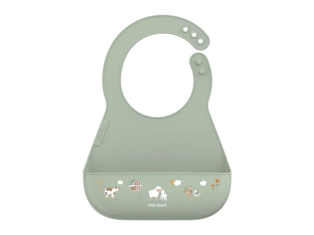 Bryndák z jemného, pružného silikonu s krásným potiskem je vybaven širokou kapsou pro zachycení drobečků i kapek. Dokonale ochrání oblečení dítěte již od prvních pokusů o samostatné stolování. Zapínání za krkem umožňuje snadno upravit velikost kolem krku.