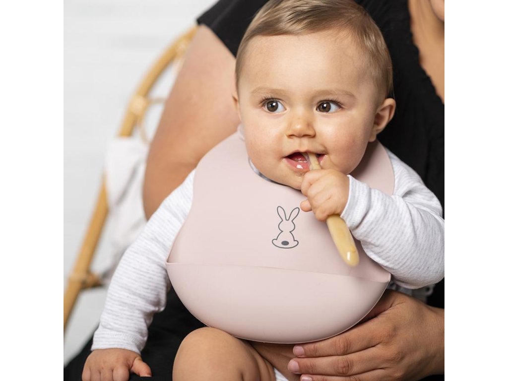 Bryndák Nattou vyrobený z pružného silikonu s motivem roztomilých králíků a praktickou sběrnou částí zajistí krmení a jedení vašeho děťátka bez zbytečného stresu z nepořádku.