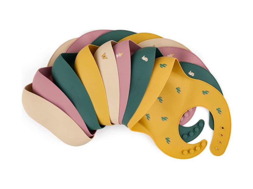 Bryndák je vyroben z potravinářského silikonu bez obsahu BPA. Je určen pro malé děti od 6 měsíců, kterým se zavádějí první příkrmy, a pro ty, které se již úspěšně učí samostatně jíst. Má nastavitelné zapínání, které umožňuje přizpůsobit jej velikosti krku dítěte. To znamená, že bryndák roste spolu s děťátkem. Díky ergonomickému tvaru a měkkému materiálu se bryndák pohodlně nosí a neomezuje pohyb dítěte při jídle. Dá se také srolovat, a proto nezabírá moc místa v tašce, když jedete na procházku nebo na výlet.
