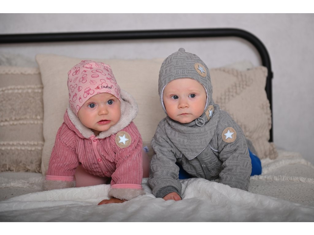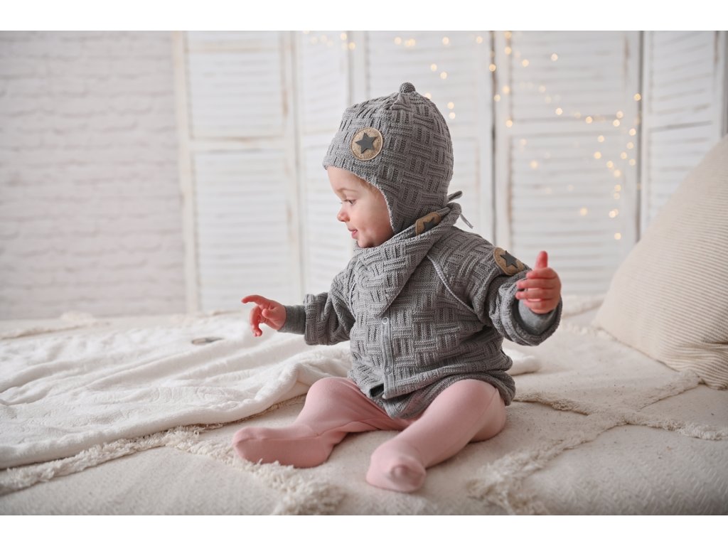 Podšitý kabátek Outlast® je stylový kousek do chladných měsíců. Vrchní strana kabátku je z měkkého bavlněného úpletu, vnitřní podšitou část tvoří materiál Outlast® s bavlnou. Tento materiál je oblíbený především díky svým termoregulačním schopnostem, kdy přebytečné teplo odvádí od těla a zabraňuje pocení. Nahromaděné teplo dokáže Outlast® uvolnit ve chvíli, kdy teplota klesne. Dítě se cítí komfortně po celou dobu nošení. Kabátek je módního střihu, zapíná se pomocí druků na přední straně a rukávky kabátku můžete ohrnout do manžety. Materiál kabátku je velmi pružný a přizpůsobivý, takže vydrží i více velikostí.