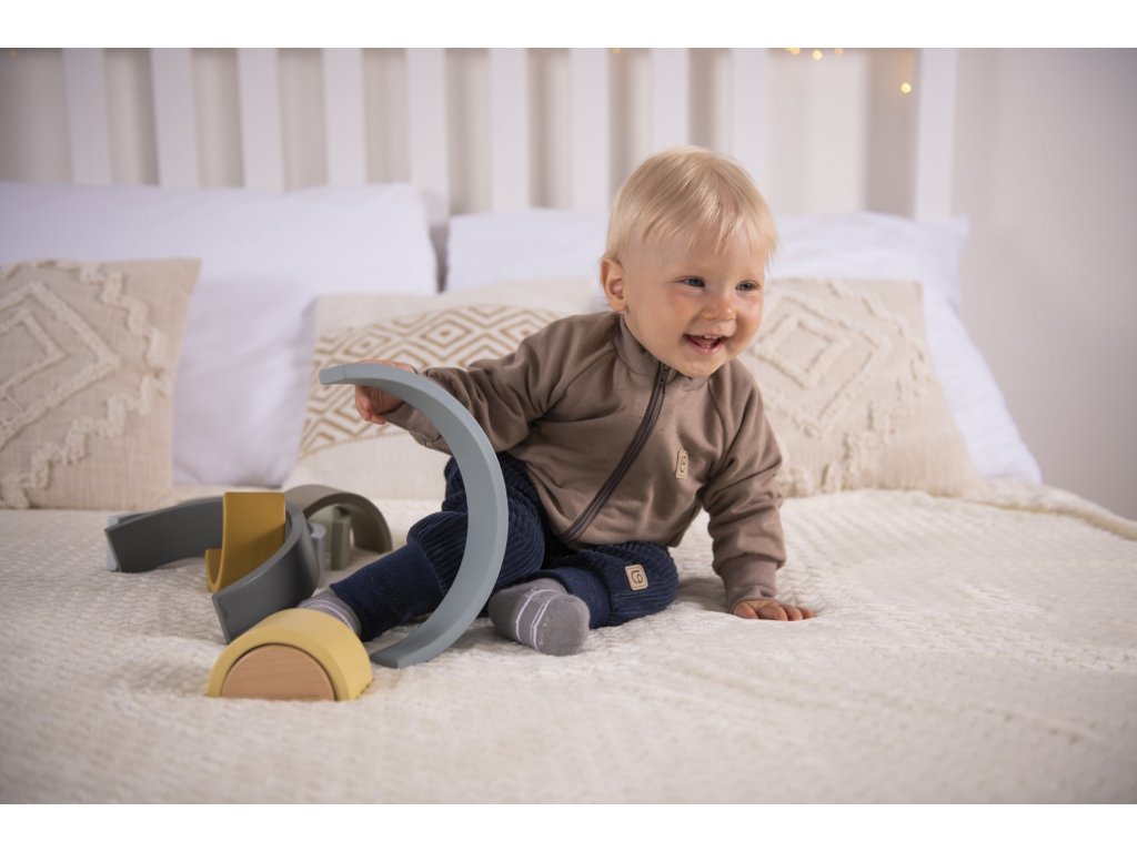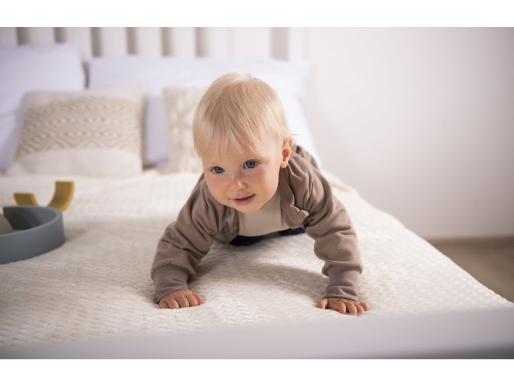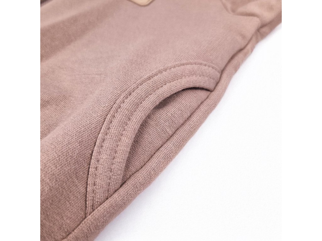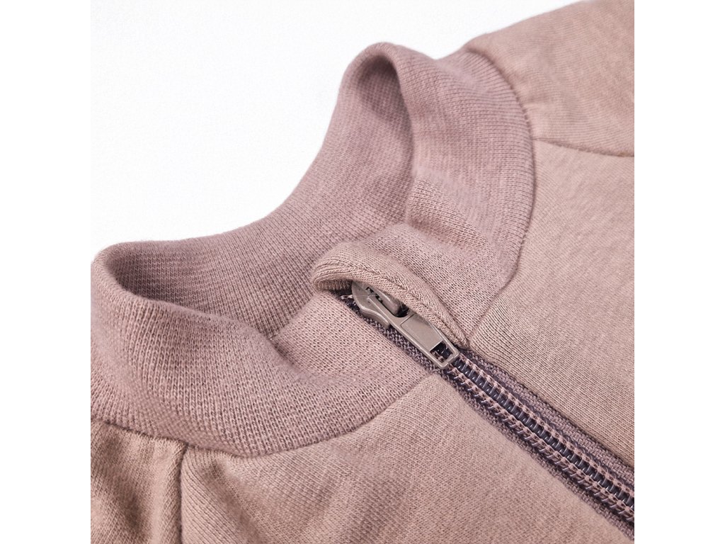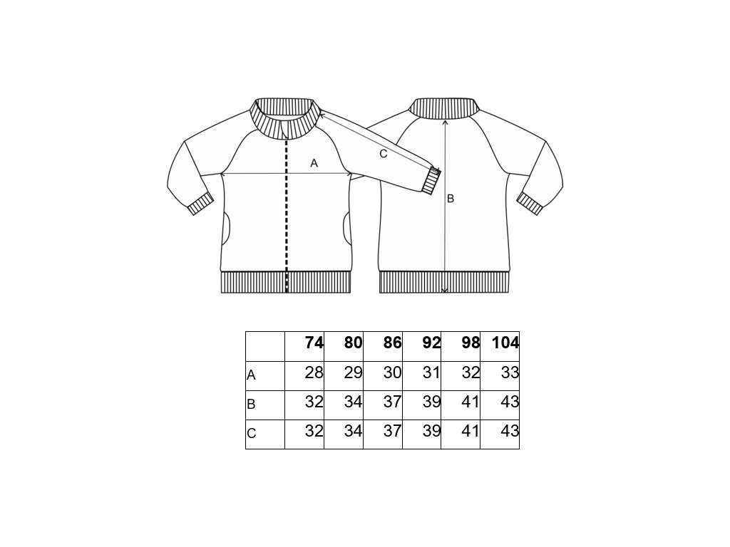 Mikina má vepředu praktické zapínání na zip a u krku je zakončena slušivým stojáčkem. Po zapnutí můžete jezdec zipu schovat do speciální krytky a zabránit tak otlačení brady. Rukávy mikiny jsou ukončeny módními širokými náplety, které můžete ohrnout a přizpůsobit délku rukávů aktuální velikosti dítěte. Tímto způsobem se mikina přizpůsobí více velikostem a dítě ji může nosit o to déle.