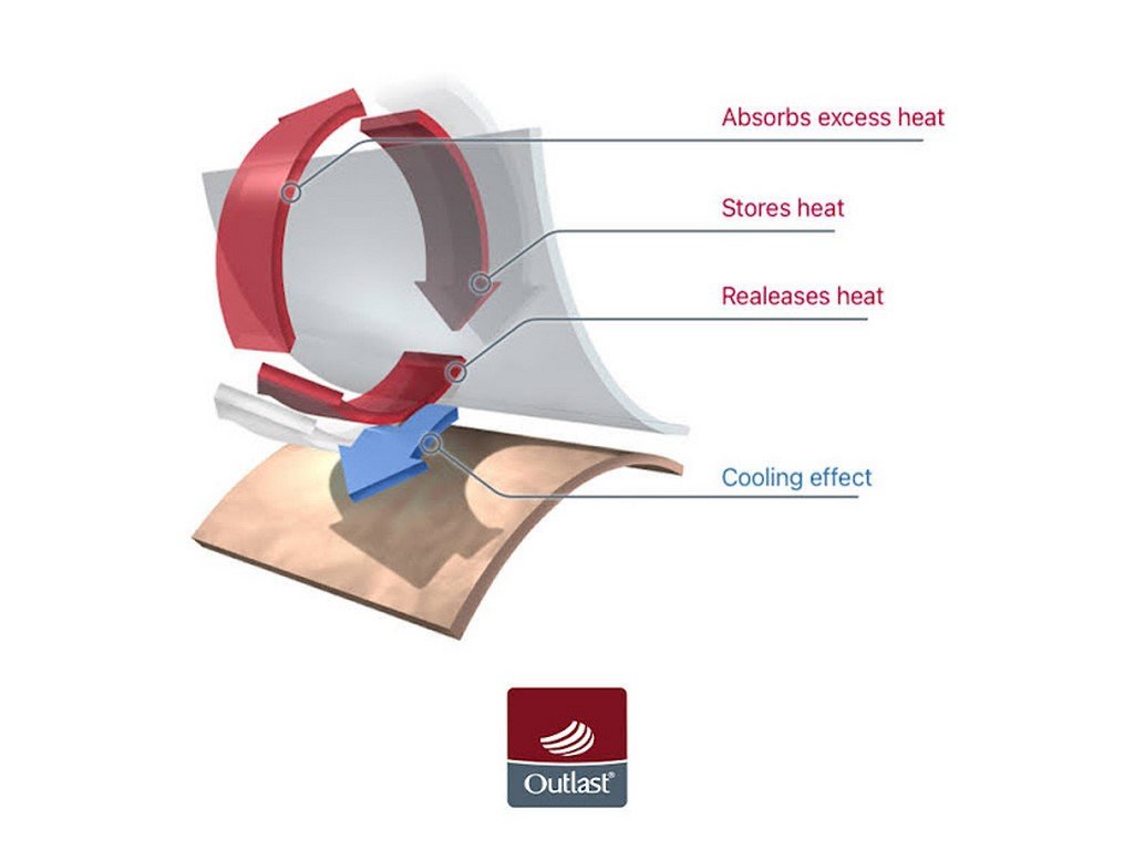 Funkčnost materiálu zaručí, že při nadměrném zahřátí těla dokáže Outlast® nadbytečné teplo odvést a uložit, a v okamžiku snížení teploty jej opět použije a zahřeje. Je tak zajištěný teplotní komfort po celou dobu nošení. Termoregulační materiál s bavlnou omezuje pocení.