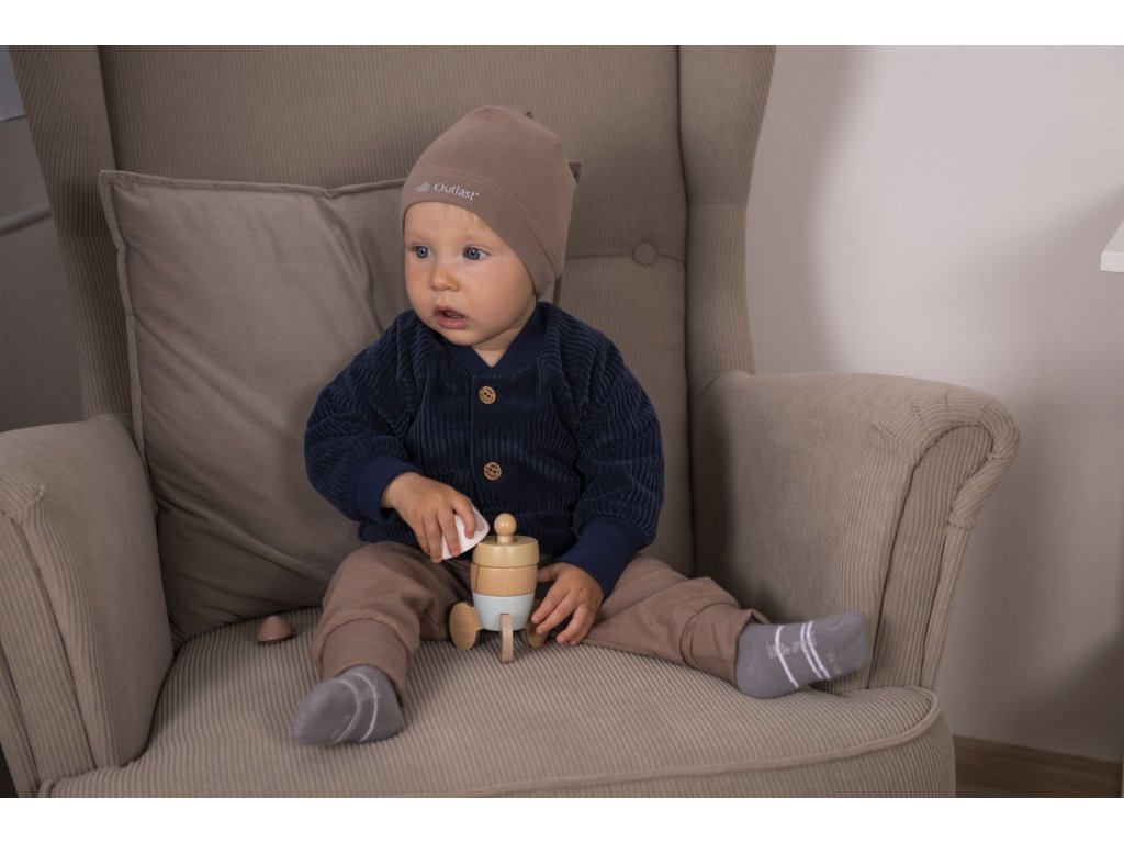 Natahovací čepička je vyrobena z bavlněného úpletu s příměsí termoregulačního materiálu Outlast®. Tento materiál dokáže efektivně pracovat s tělesným teplem. V případě zahřátí nadbytečné teplo odvede a v okamžiku snížení teploty nahromaděné teplo opět uvolní a zahřeje. Dítě tak bude mít zajištěný teplotní komfort o celou dobu nošení, nezpotí se a ani neprochladne. Materiál Outlast® je zde zastoupen v teplejší smykové variantě. Čepička je tedy vhodná především na chladnější měsíce, využít ji můžete v jarních nebo podzimních měsících. Čepička má nažehlené etikety, takže během nošení nikde neškrábou a ani netlačí. Pohodlný střih se přizpůsobí každému tvaru hlavy a díky pružnému materiálu čepička vydrží i více velikostí. Natištěné logo Outlast® je reflexní a podpoří tak vyšší viditelnost v přítmí.