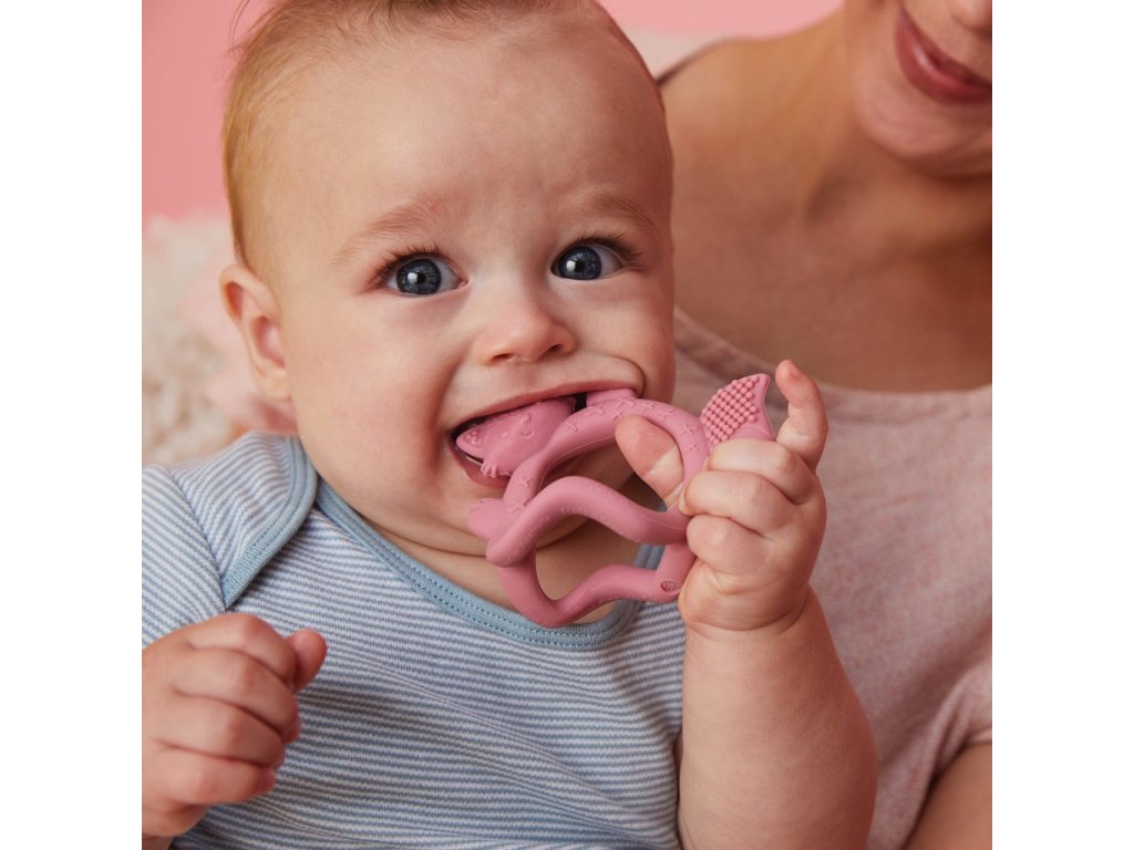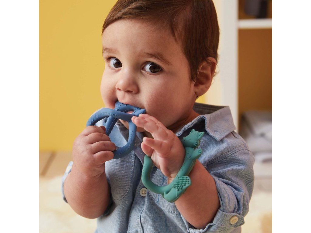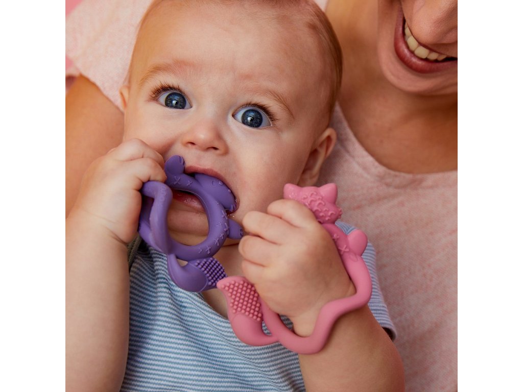 Kousátko na zápěstí lze použít k poskytnutí úlevy v různých fázích prořezávání zoubků. Je lehoučké a snadno se drží.