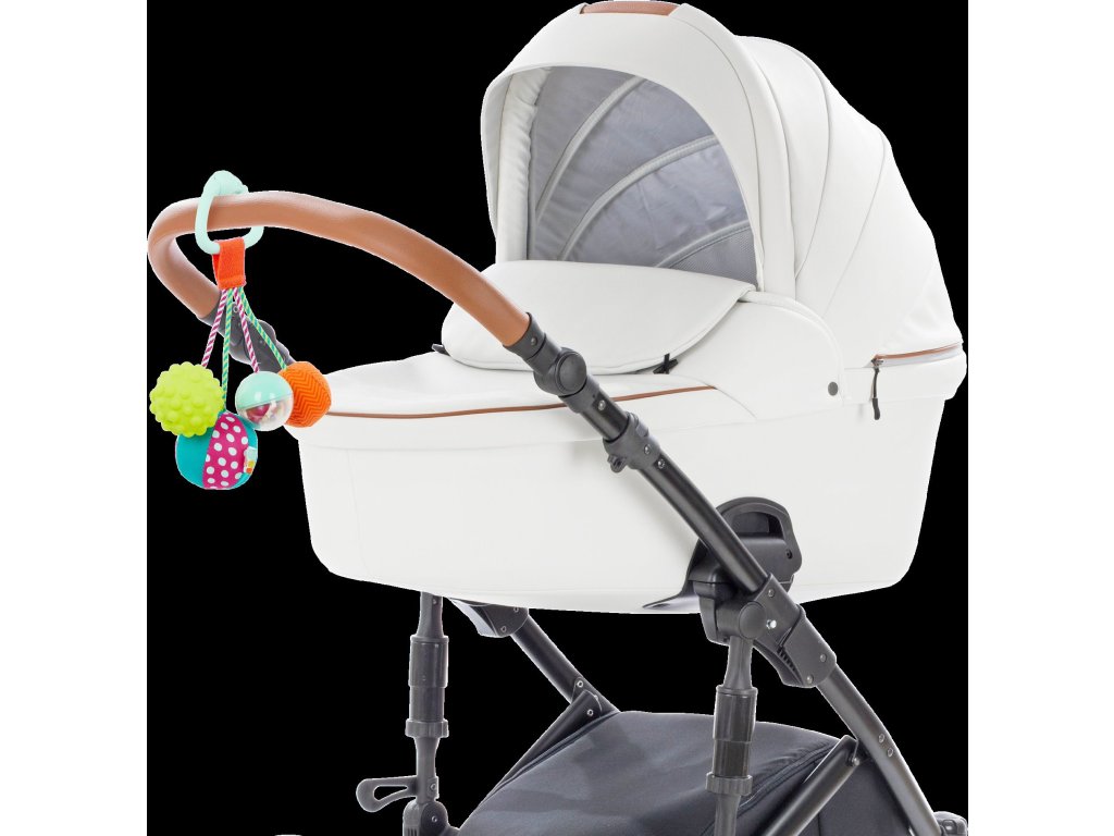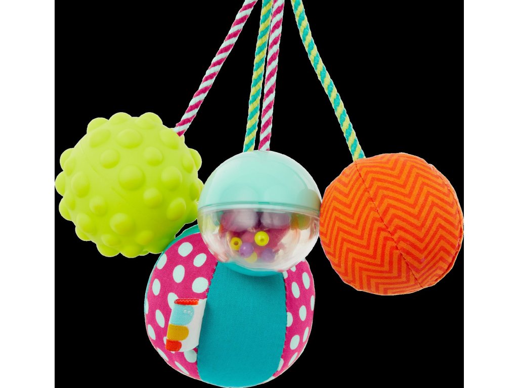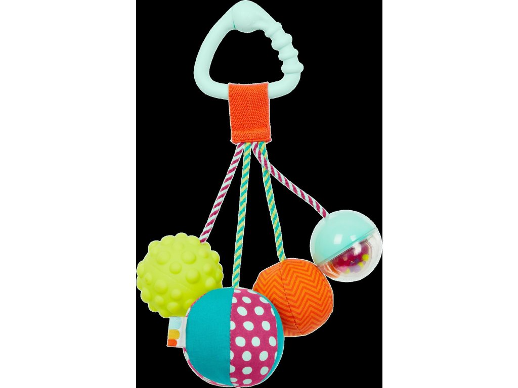 Závěsné chrastítko s míčky ve výrazných kontrastních barvách nabízí různorodé textury i zvuky - jednotlivé míčky cinkají, chrastí, pískají i šustí. Závěsný kroužek slouží i jako kousátko.