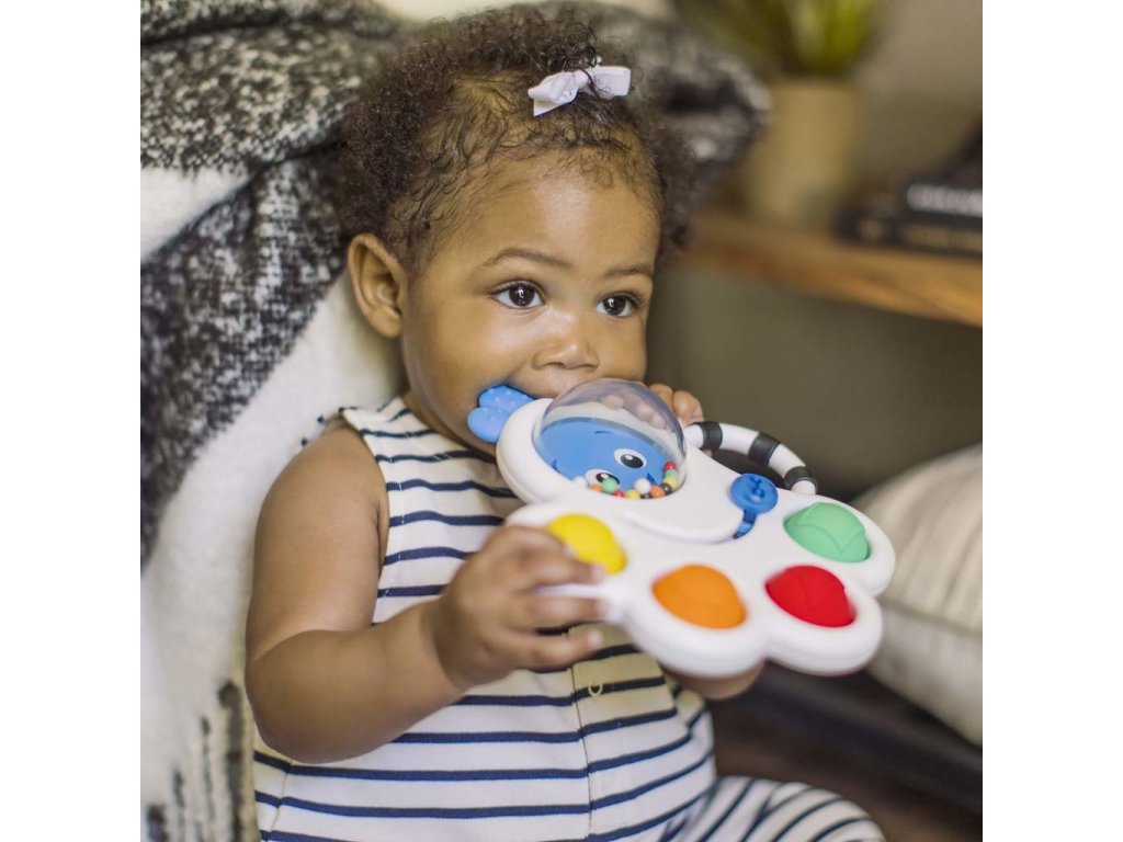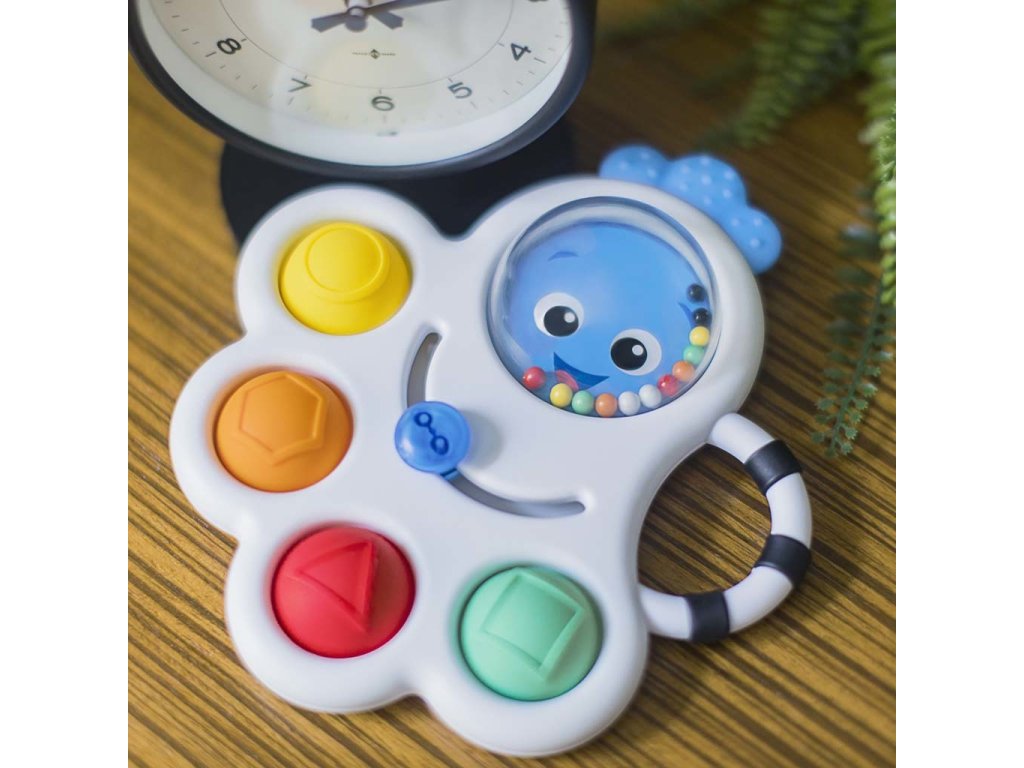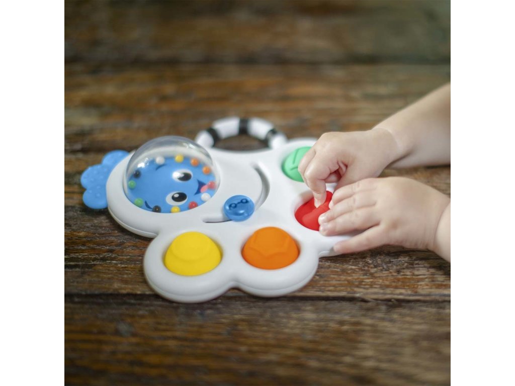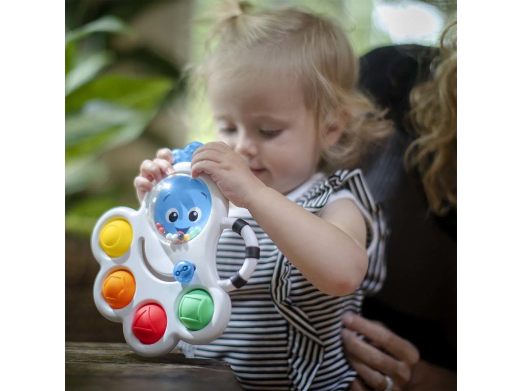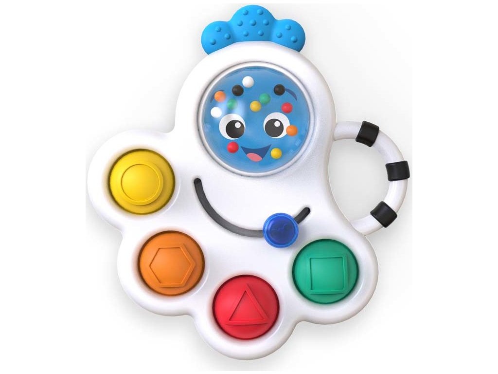 Hračka Opus Shape Pops ™ 3 v 1 je kousátko, chrastítko a senzorická hračka, která jistě zaujme a udrží pozornost vašeho děťátka. Její barevné a měkké bublinky jsou pro dítě tak zábavné, že jejich nepřestane šoupat a mačkat, protože ho odměňují jemným zvukem praskání. Chobotnička Opus je jednou z oblíbených postaviček z knih a videí Baby Einstein ™ na YouTube. Díky několika aktivitám na jednom místě, hračka vybízí ke kreativní hře a také části na kousání uklidní bolavé dásně při prořezávání prvních zoubků.