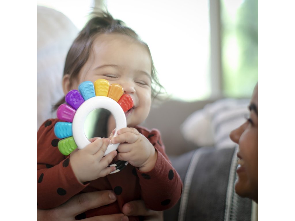 Tato hračka je plná vizuálních stimulací, podporuje jemnou motoriku, kreativitu a objevování příčin a následků, kde zároveň představuje i jednotlivé barvy a tvary. Díky bezpečnému zrcátku také děťátko objevuje samé sebe. Roztomilé držadlo s tlustými černými a bílými pruhy je pro miminka a batolata snadno uchopitelné. Hračka je vyrobena z materiálu, který neobsahuje BPA a snadno se udržuje v čistotě – stačí otřít vlhkým hadříkem. Tato úžasná hračka je vhodná pro chlapce a dívky ve věku od 3 měsíců.