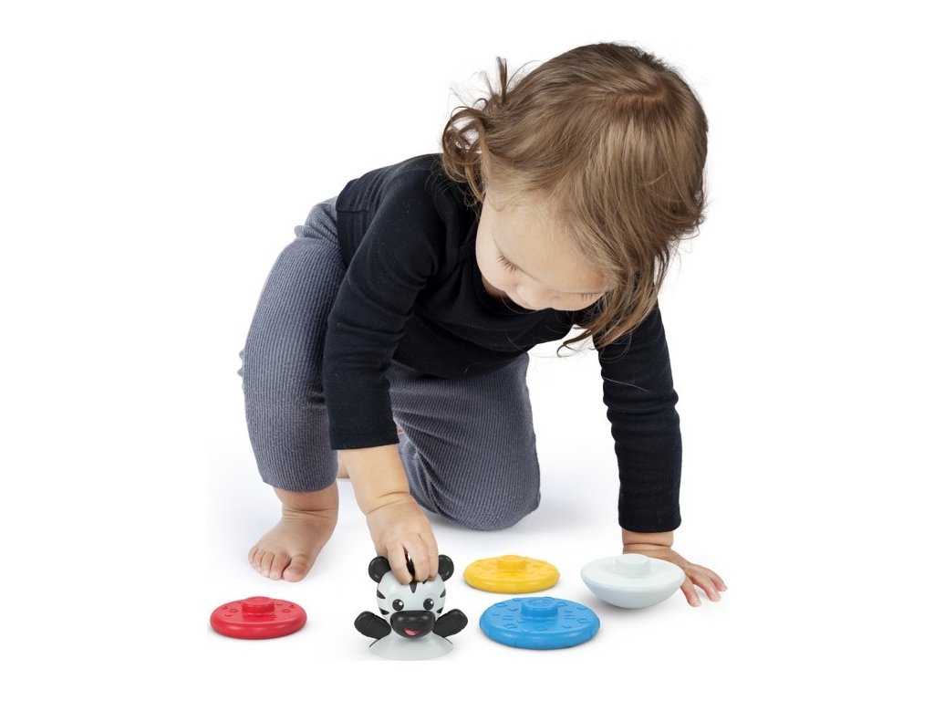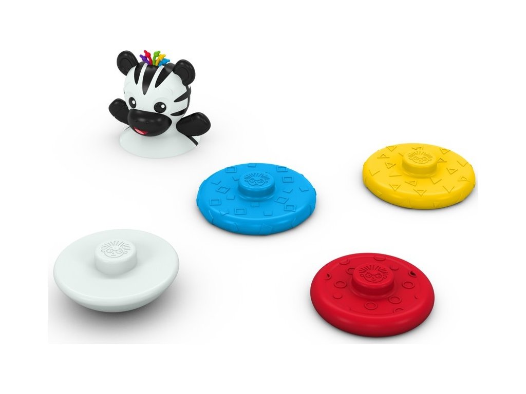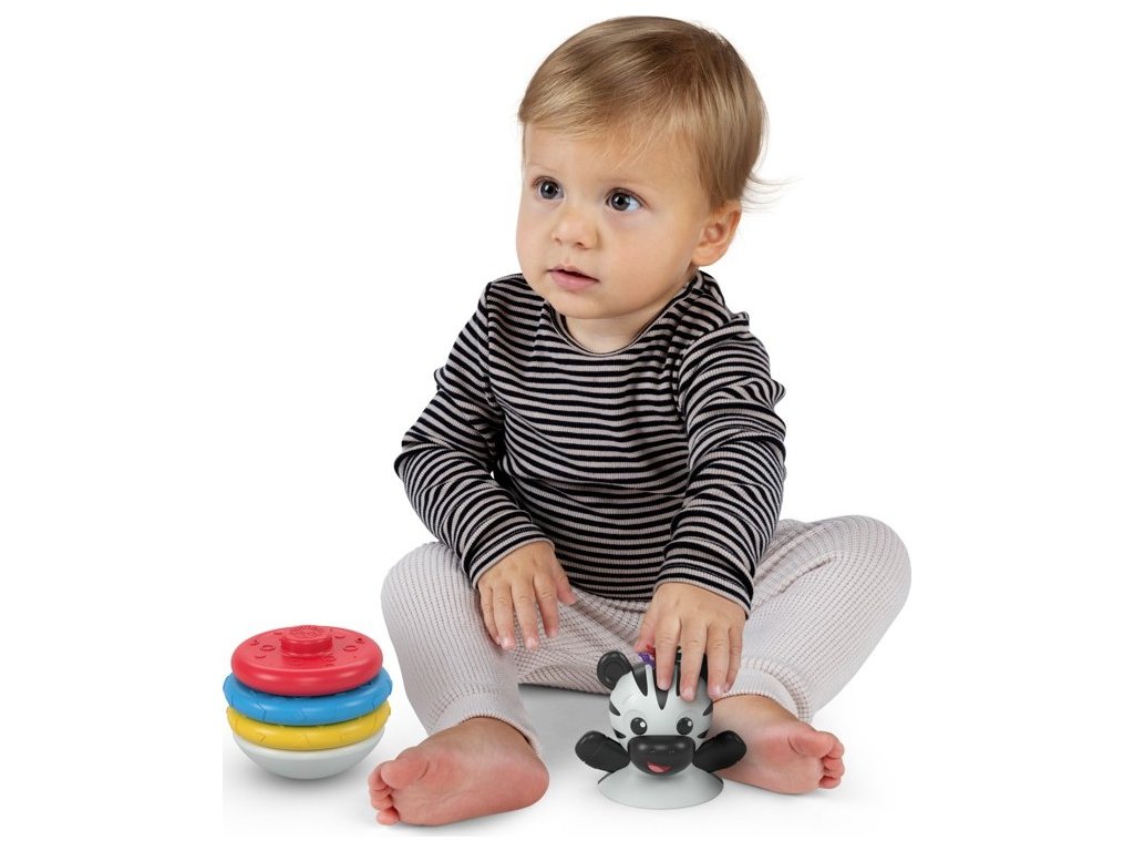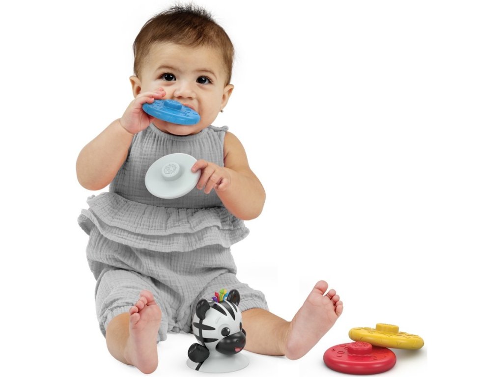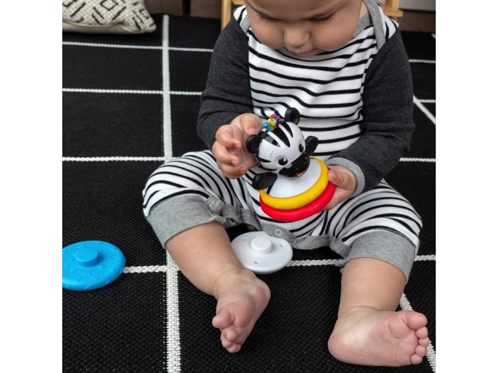 Hračka Baby Einstein Stack & Wobble Zen Teether je hračka, se kterou můžete bouchat, stavět, třást, uklidňovat a zkoumat. Tato barevná pískací hračka pomáhá podporovat učení dítěte o příčině a následku. Jasně barevné kroužky bez obsahu BPA mají texturu, která uklidňuje bolavé dásně a pomáhá budovat první smyslové dovednosti dítěte. Díky motivu zebry Zen z pořadů a knížek Baby Einstein si mladší děti zamilují bouchání do kostky, aby se Zen rozhýbal, což podporuje učení o příčině a následku. Pomocí 4 odnímatelných disků se starší děti naučí základní barvy, počítání a skládání na sebe.