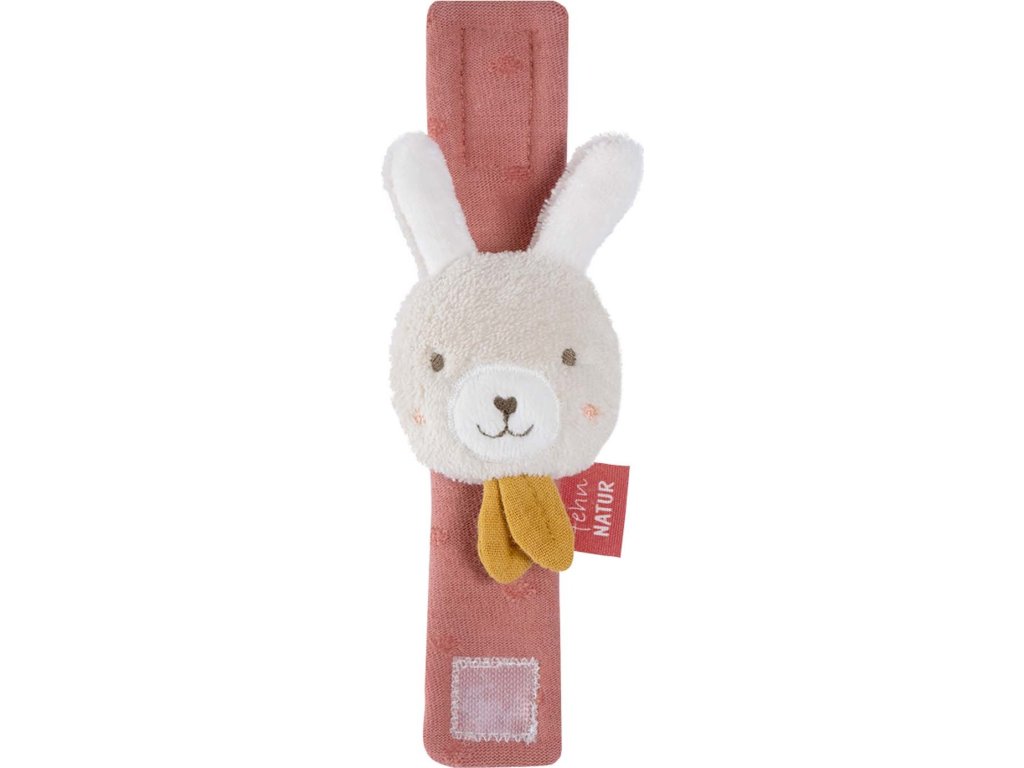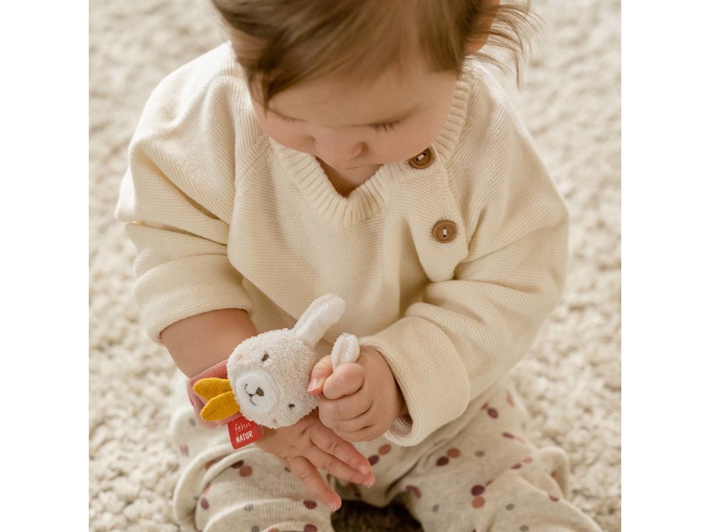 Snadno se nasazuje na ručičku, pří pohybu děťátka – třesení ručičkama vydává fascinující zvuky, které malé děti milují. Chrastící náramek hravou formou podporuje sluch, úchop a hmat miminka i jemnou motoriku.