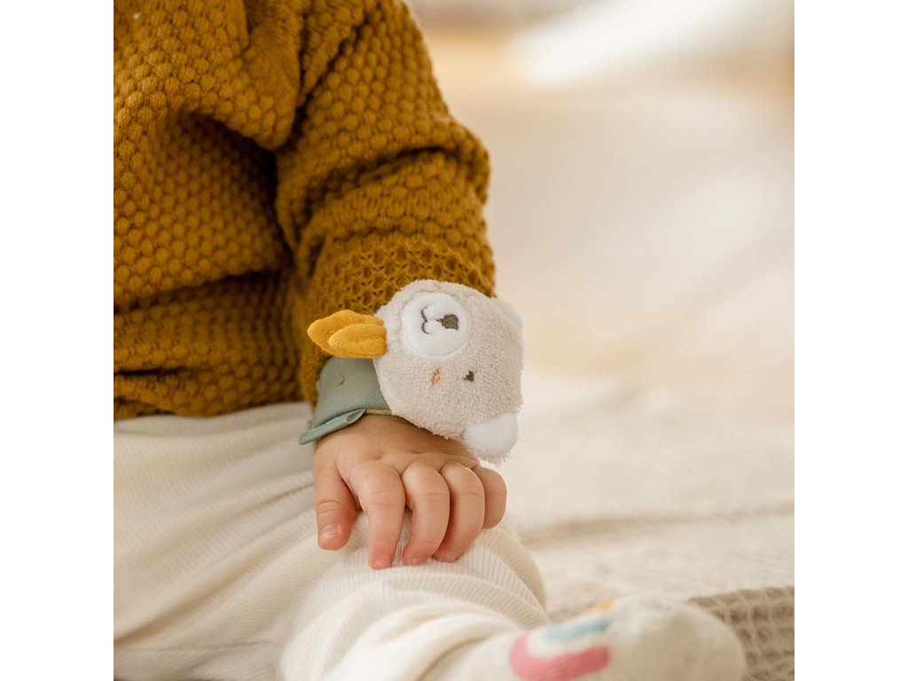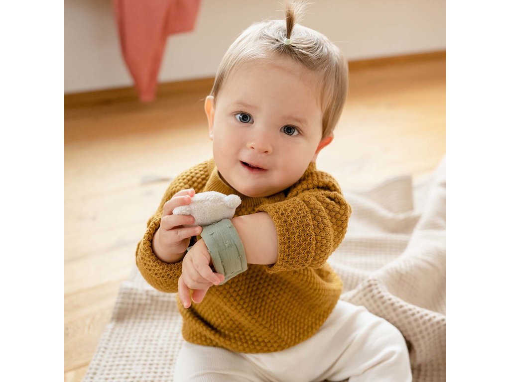 Snadno se nasazuje na ručičku, pří pohybu děťátka – třesení ručičkama vydává fascinující zvuky, které malé děti milují. Chrastící náramek hravou formou podporuje sluch, úchop a hmat miminka i jemnou motoriku.
