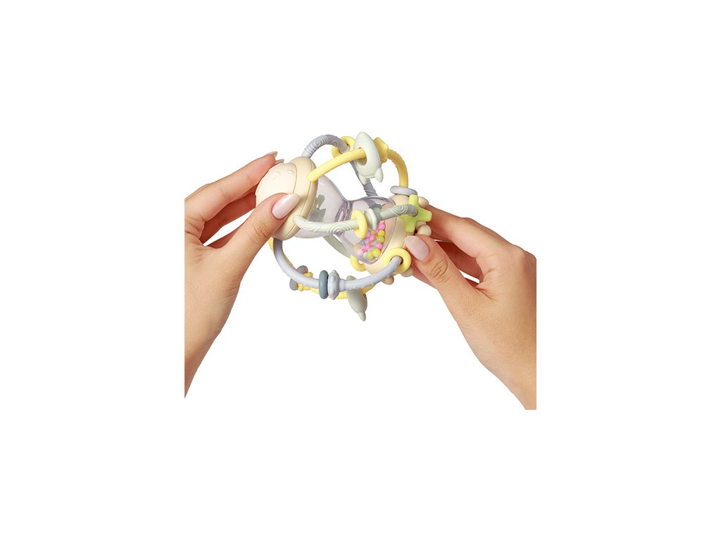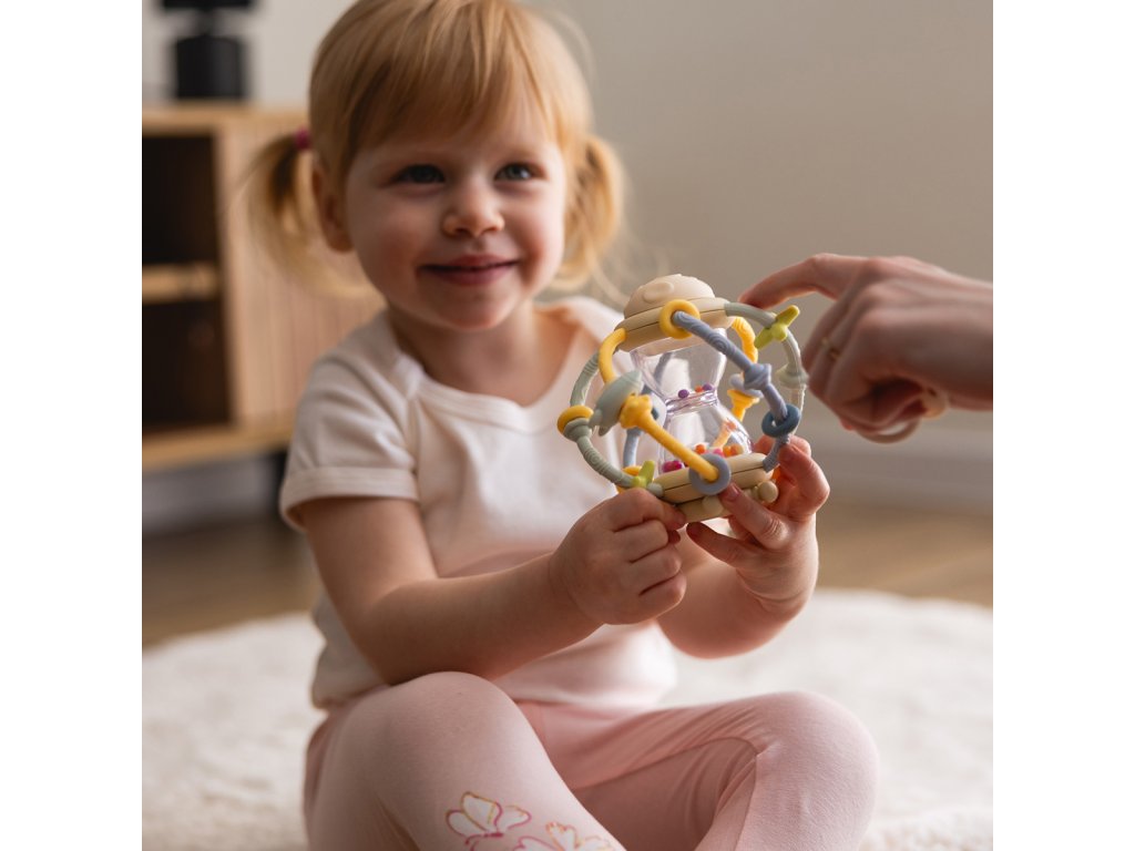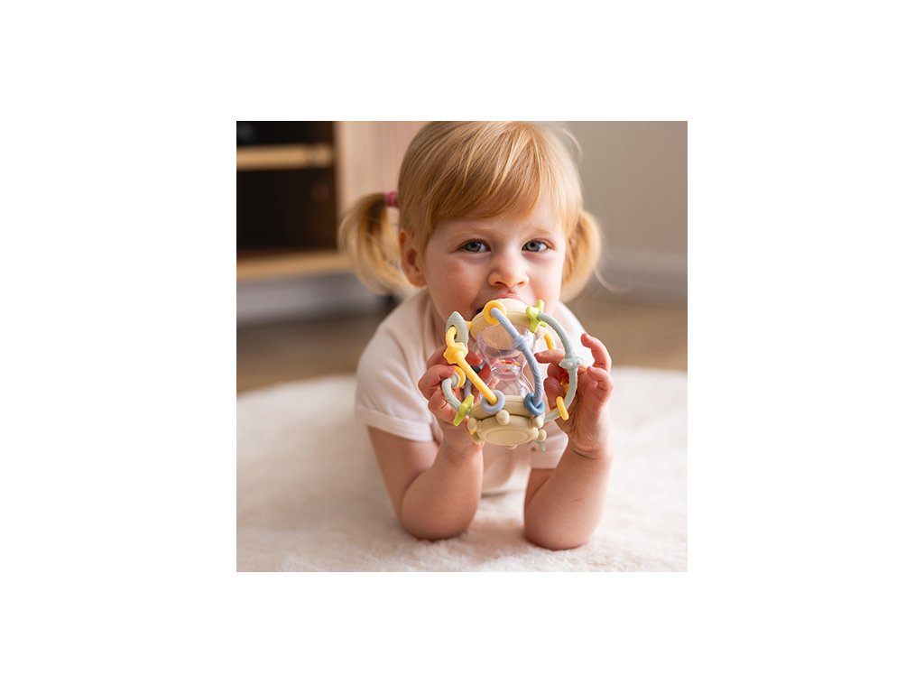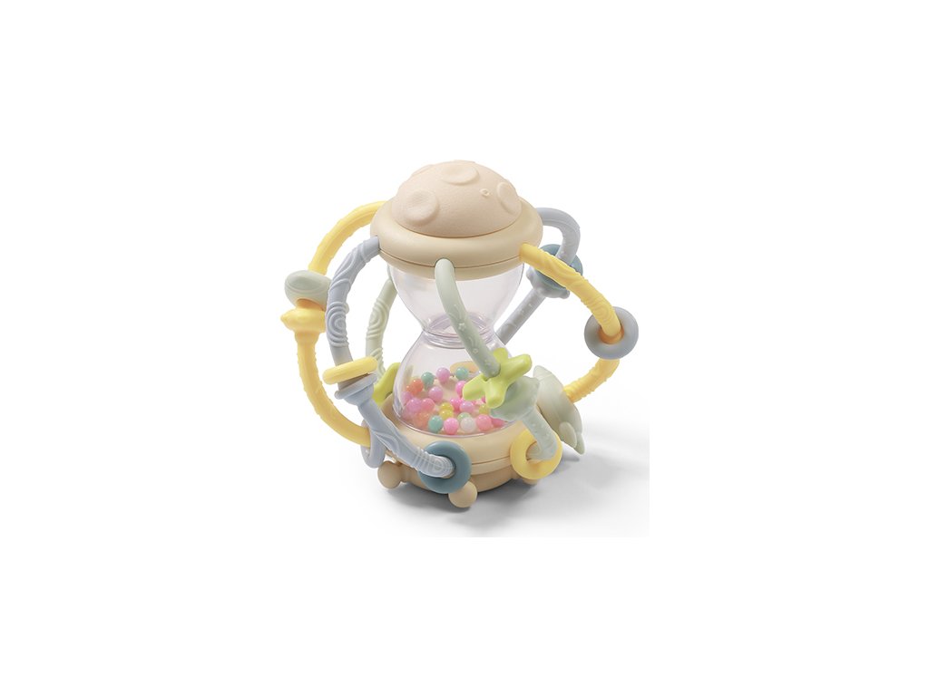 Senzorická hračka ve tvaru přesýpacích hodin – kousátko a chrastítko v jednom. Tato junikátní hračka spojuje měkké kousátko a stimulační chrastítko. Byla navržena s ohledem na zvědavost miminek – perfektně padne do malých rukou a nabízí mnoho možností k objevování. Barevná kousátka s jemnými výstupky zklidňují dásně během prořezávání zoubků, zatímco průsvitné přesýpací hodiny s barevnými kuličkami jemně chrastí a přitahují pozornost. Vaše dítě může posouvat pohyblivé prvky po silikonových obloucích, sledovat kuličky v přesýpacích hodinách či otáčet kolečkem na spodku hračky, které vydává příjemný zvuk. Hračka je z netoxického silikonu a plastu PP, takže je bezpečná pro hru již od prvních měsíců života.