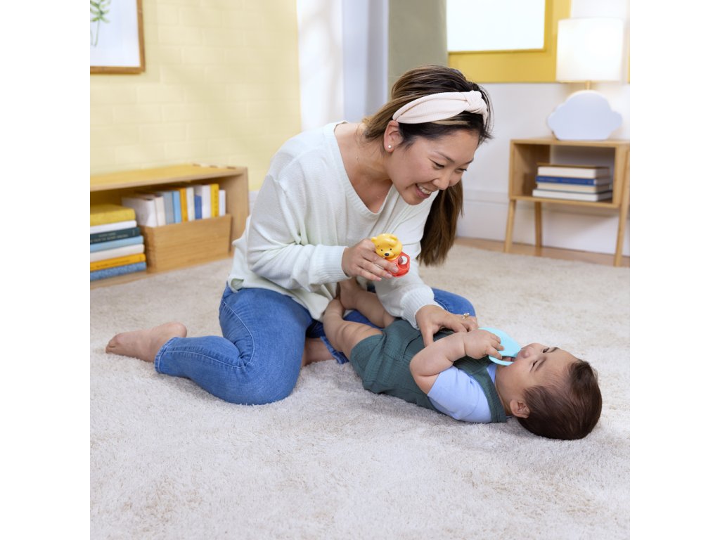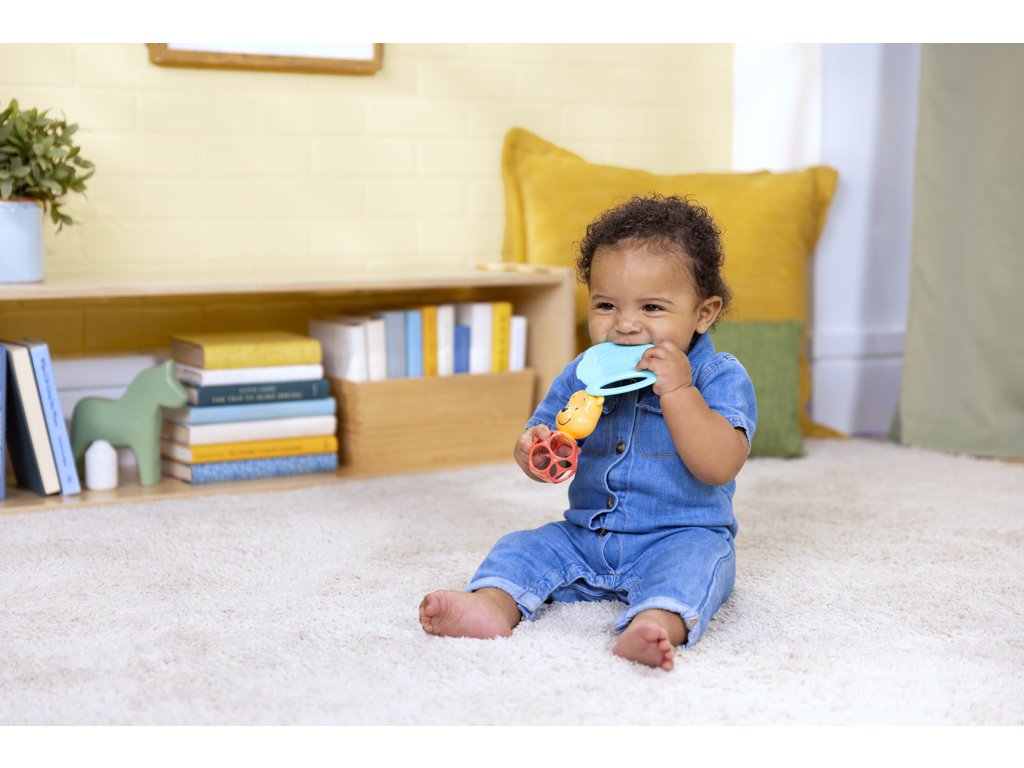 - Chrastítko Oball - lehká, pružná a ideální pro drobné ručičky – podporuje jemnou motoriku, sluchové vnímání a hmatové objevování.
