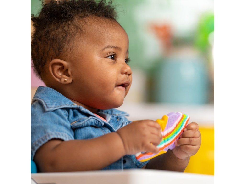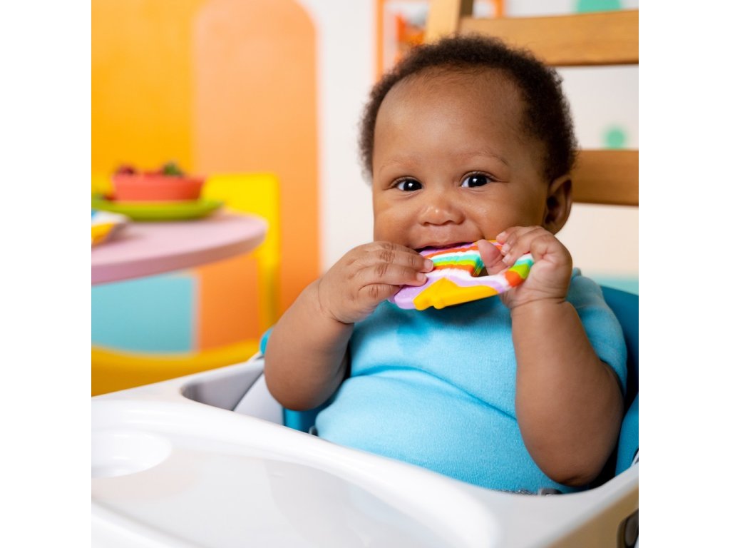 Toto univerzální kousátko ve tvaru zmrzlinového kornoutu je navrženo tak, aby uklidnilo bolavé dásně dítěte, a to díky povrchu s různou strukturou. Vyvýšené posypky a hřebeny vaflového kornoutu... co je sladšího než tohle. Díky snadno uchopitelnému designu se dítě může držet rukojeti vaflového kornoutu a samo si uklidnit zoubky, kdykoli potřebuje útěchu. Tento vířící "sladký" pamlsek podporuje rozvoj jemné motoriky, protože dítě kouše a uchopuje pestrobarevný dezert.