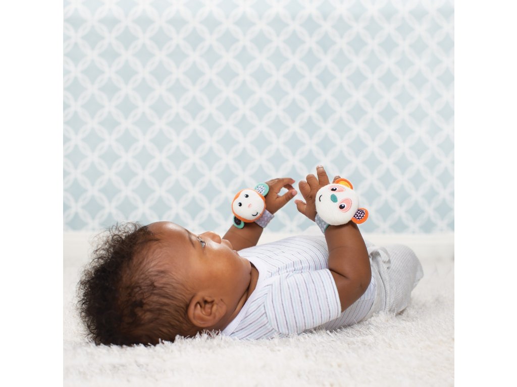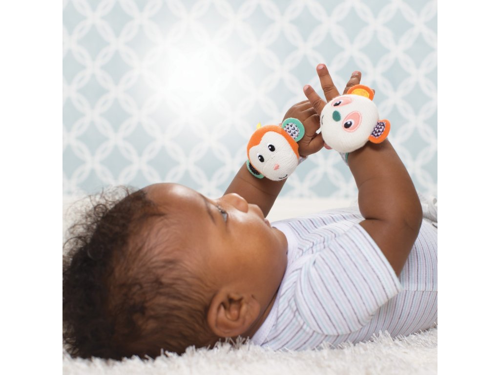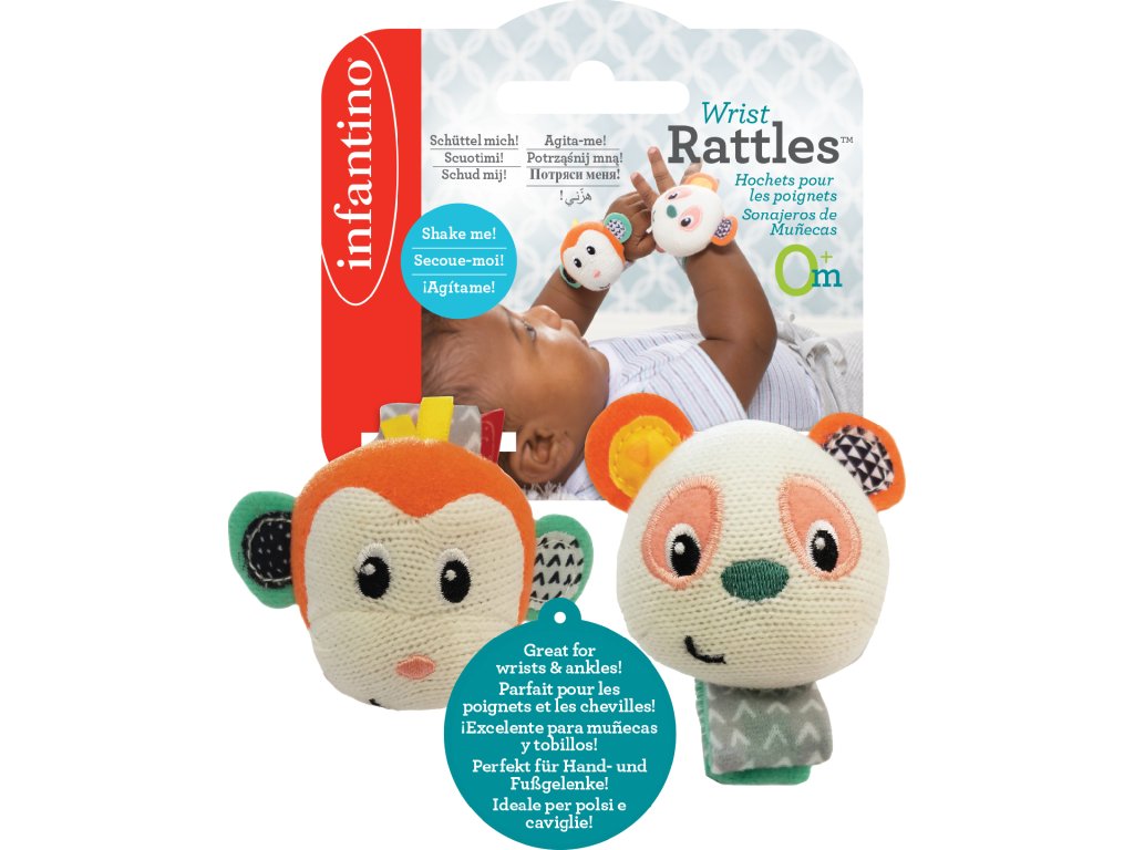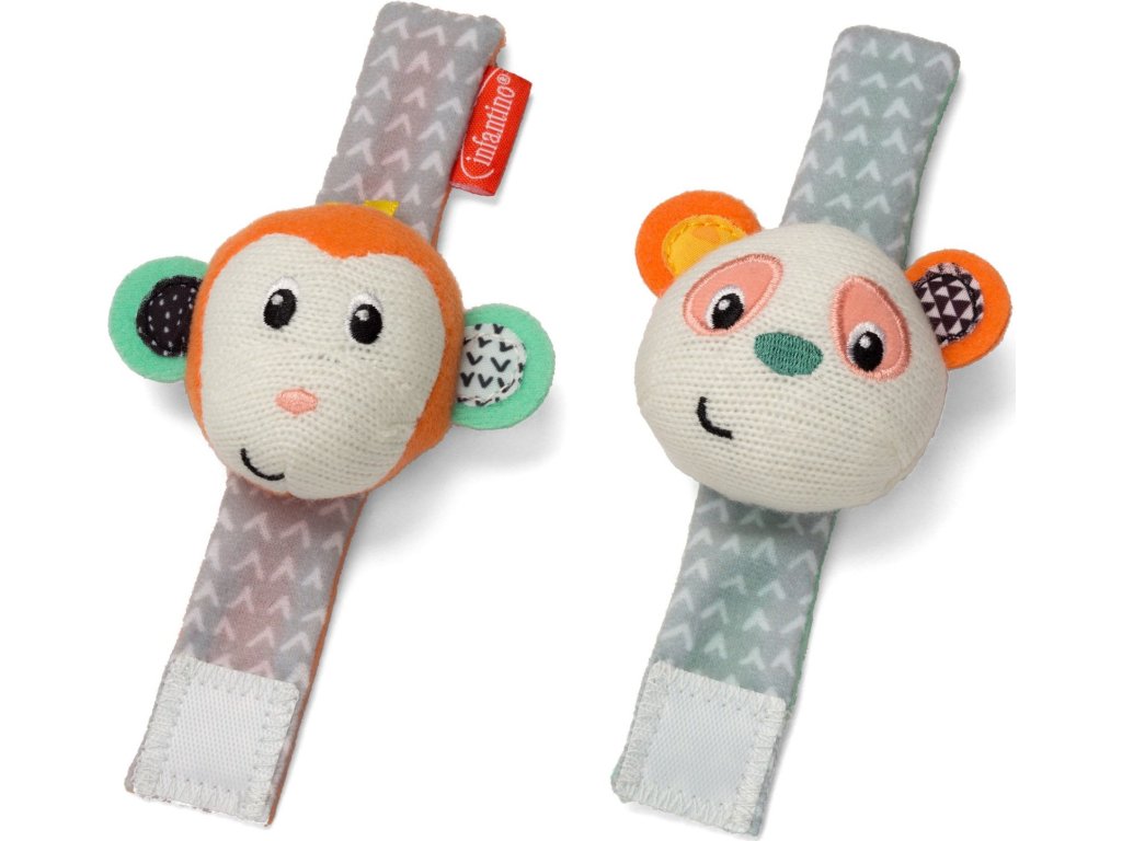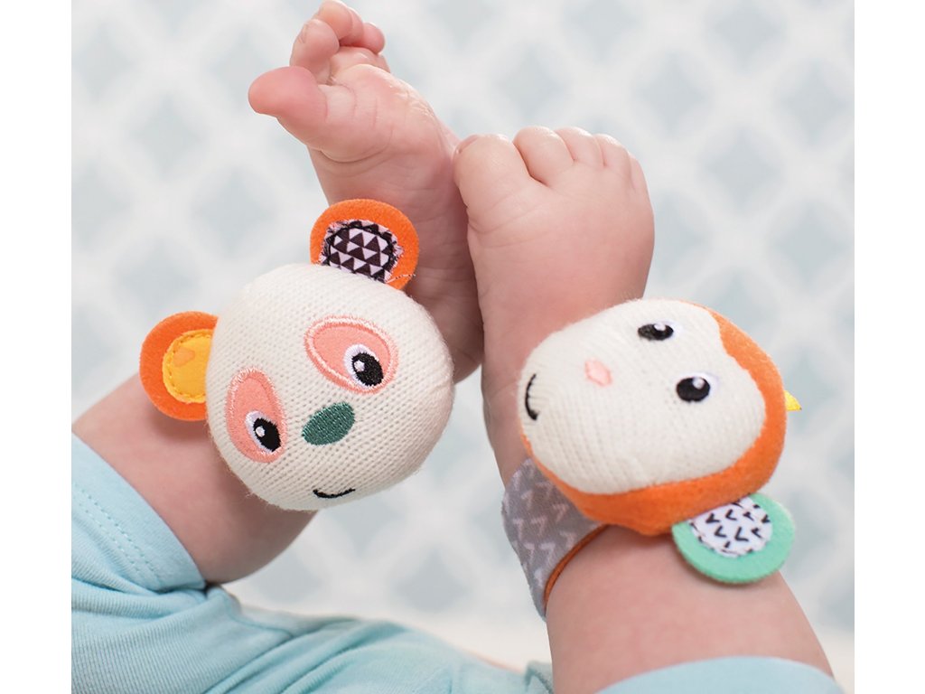 Chrastítka s veselými obličeji opičky a pandy podněcují rozvoj sluchu, zraku a hmatu dítěte. Chrastítka se snadno připevní s pomocí suchého zipu dítěti na zápěstí (nebo v pozdějším věku na kotníky). Dítě se otáčí za zvukem a sleduje výrazné barvy hračky.