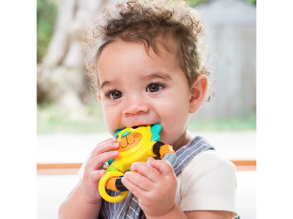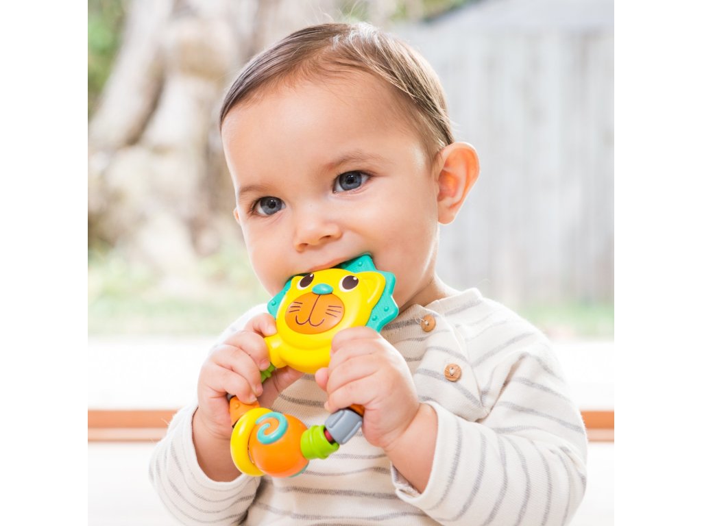 Bezpečné chrastítko a kousátko ve výrazných barvách dítě zabaví i uleví jeho citlivým dásním při prořezávání zoubků. Různorodé textury podněcují dítě ke zkoumání rukama i ústy. Tvar hračky umožňuje snadné uchopení dětskými ručičkami.