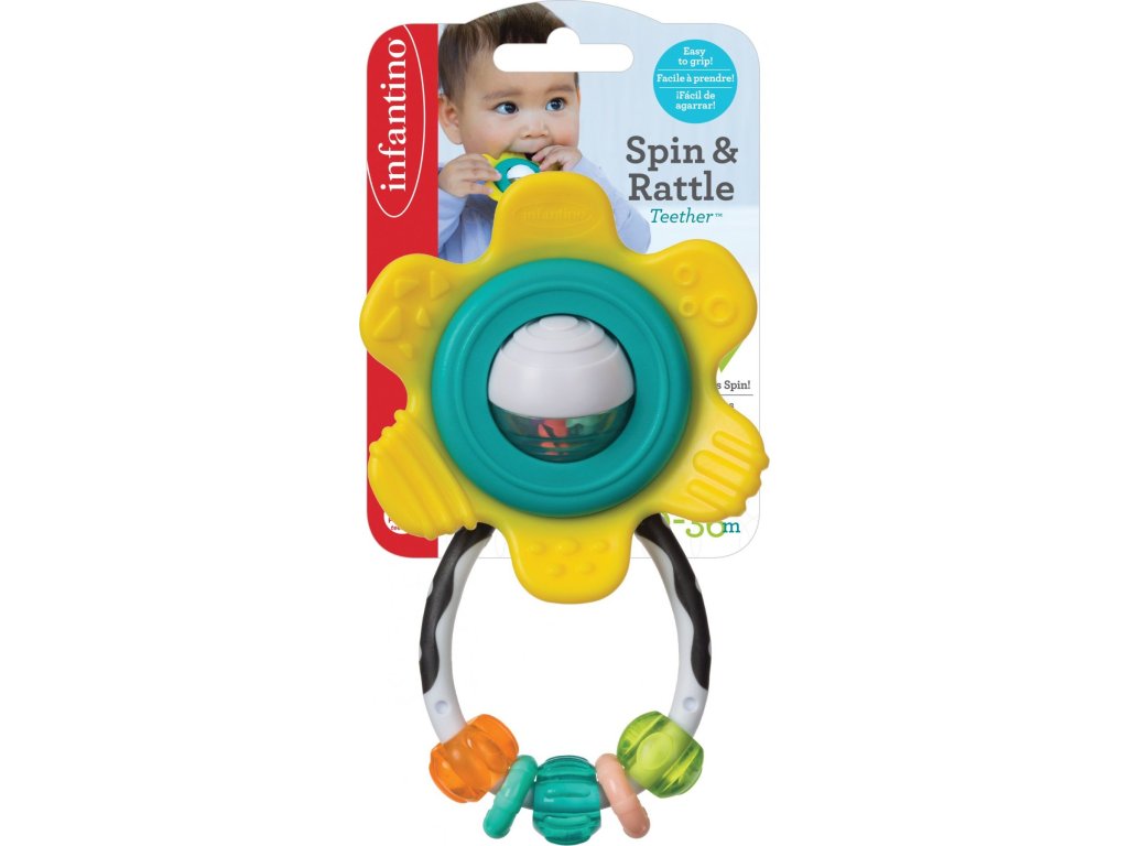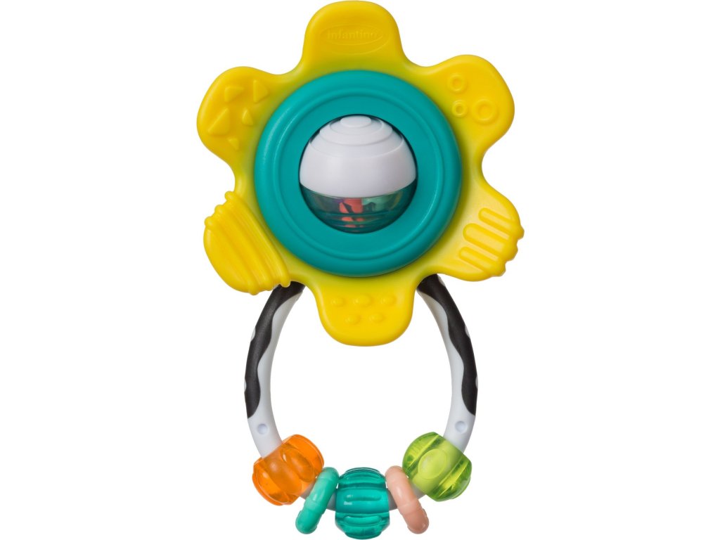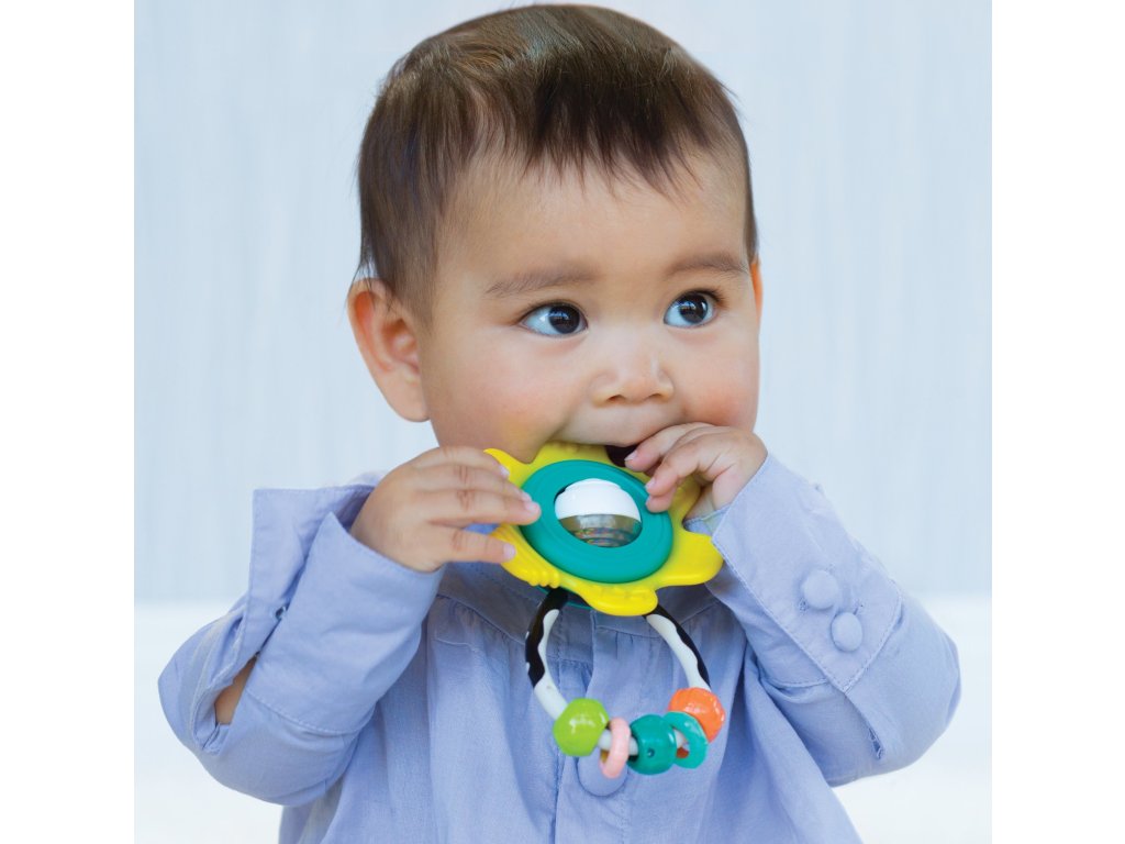 Chrastítko ve tvaru květiny má tvar pro snadné uchopení. Pozornost dítěte upoutají pohyblivé různobarevné kroužky na rukojeti i chrastící korálky v průhledné kuličce uprostřed hračky. Okvětní plátky květiny slouží jako kousátka, která dítěti pomohou při prořezávání prvních zoubků.