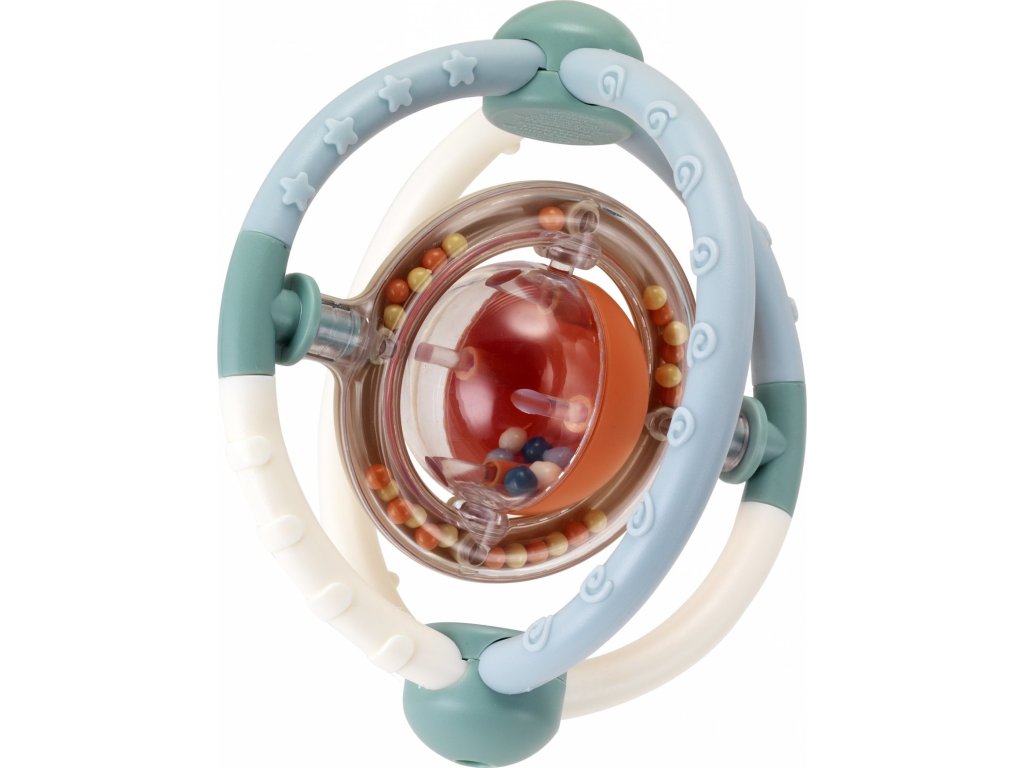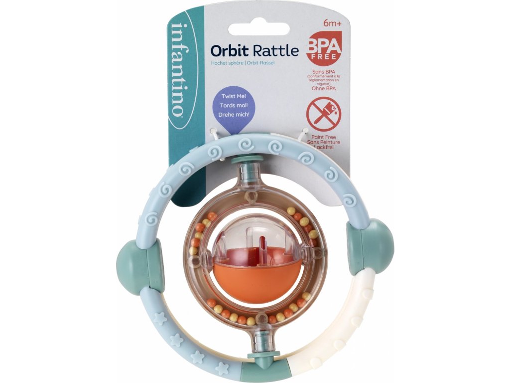 Chrastítko Infantino s různými texturami má tvar pro snadné uchopení a zkoumání ručičkami i v ústech. Korálky uvnitř průhledného kroužku při pohybu jemně chrastí.
