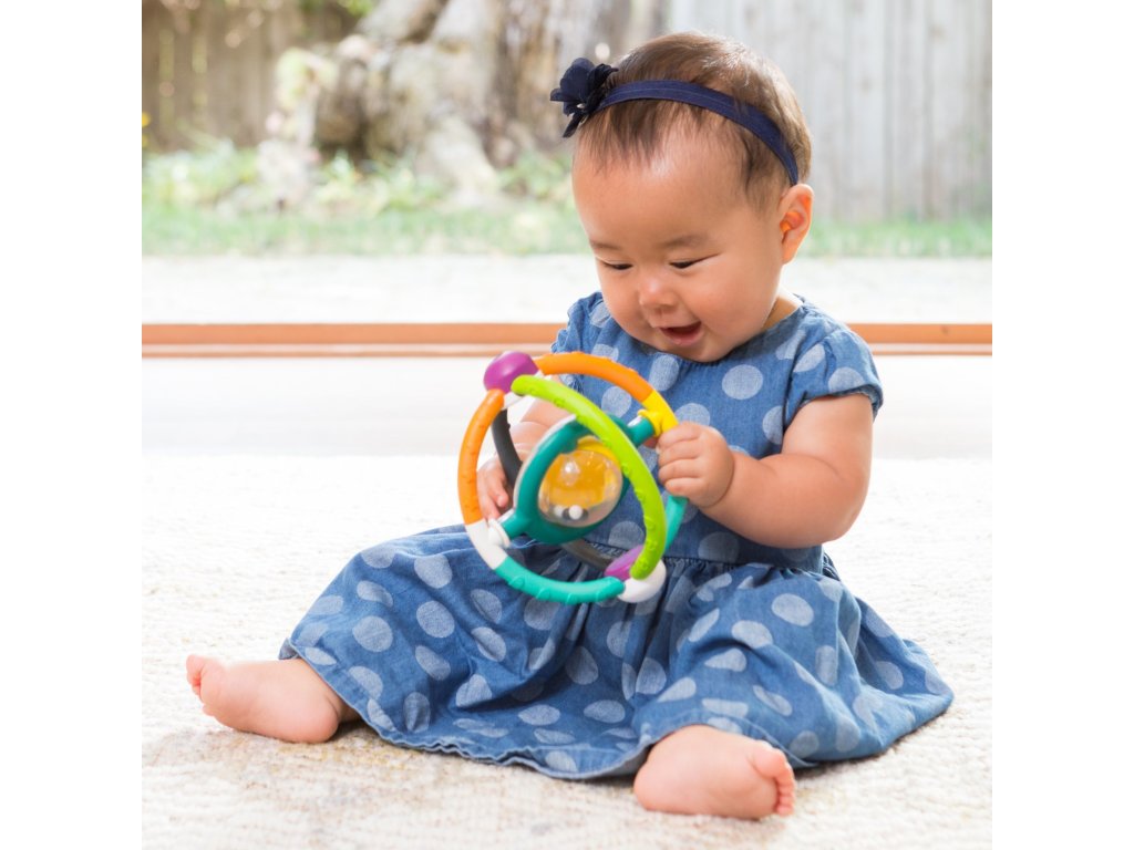 Chrastítko s různými texturami ke zkoumání má tvar pro snadné uchopení rukou i ústy. Korálky uvnitř průhledného kroužku při pohybu jemně chrastí.