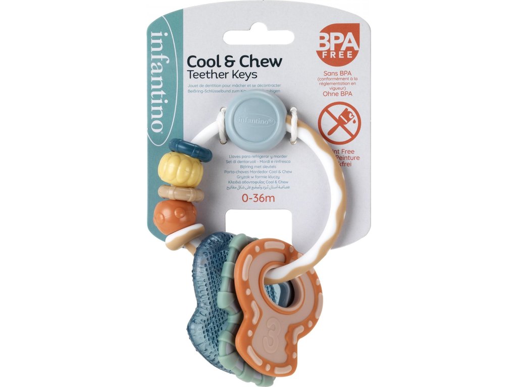 Chrastítko Infantino v podobě kroužku s posuvnými korálky a klíčky, které slouží i jako kousátka pro úlevu při prořezávání prvních zoubků. Kousátka mají různé povrchy (měkčí i pevnější) a je možné je ochladit v lednici pro větší úlevu při růstu zoubků. Hračka při pohybu jemně chrastí.