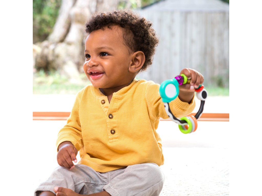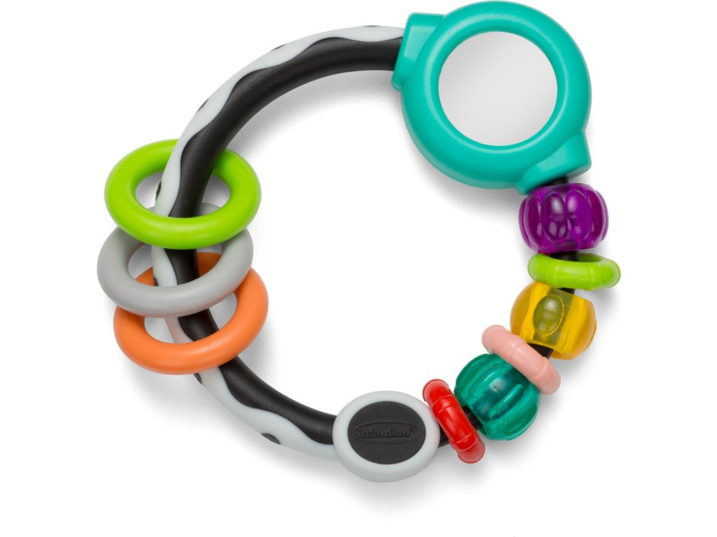 Bezpečné chrastítko tvaru, který umožňuje snadné uchopení dětskými ručičkami. Pohyblivé barevné kroužky a korálky i bezpečné zrcátko upoutají pozornost dítěte a podněcují jej ke zkoumání. Vhodné od narození.