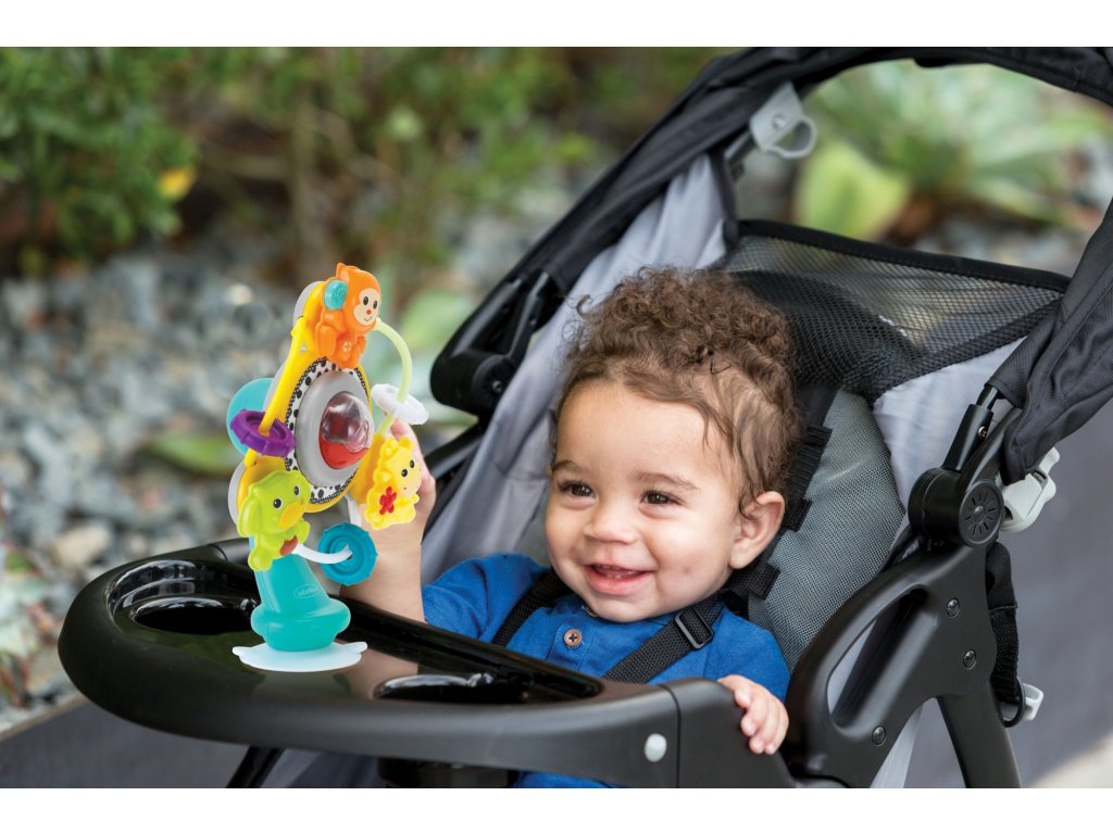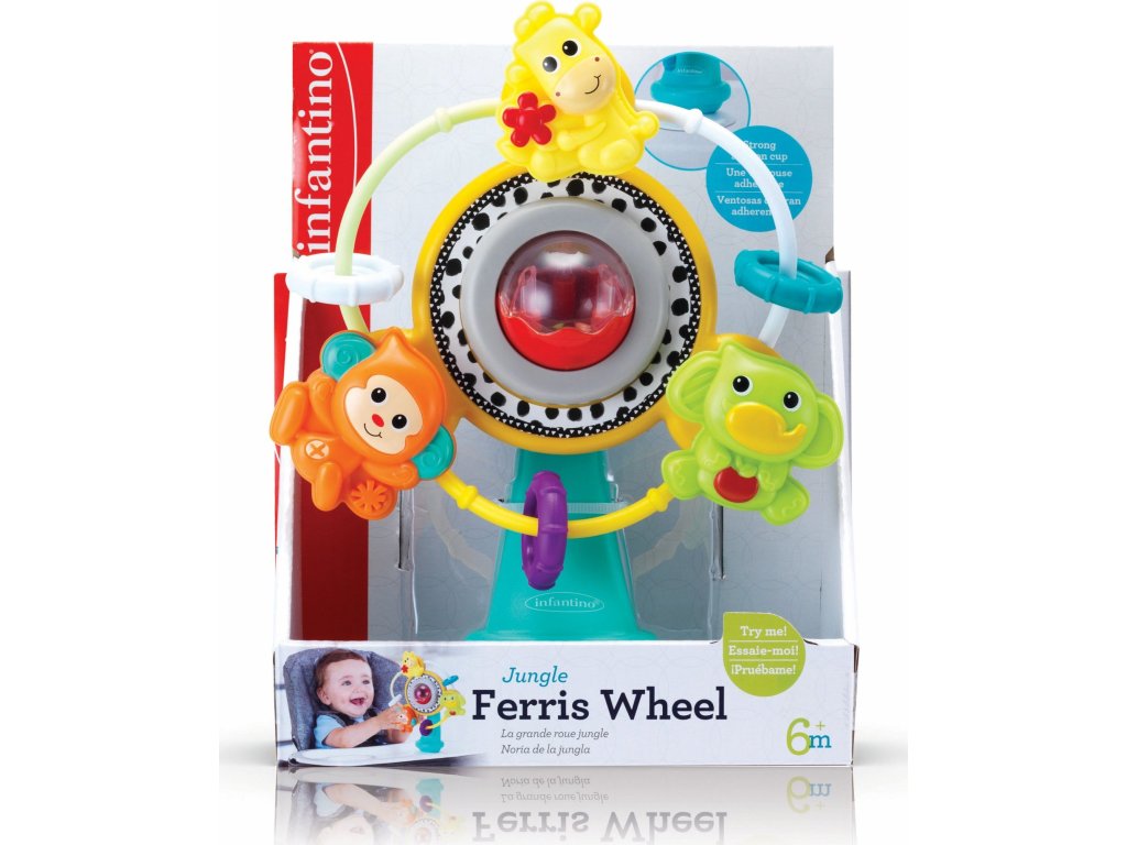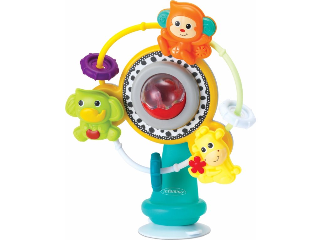 Kolotoč s přísavkou můžete připevnit např. na pultík jídlení žídličky. Kolotoč i jednotlivá zvířátka se dají rukou roztočit. Při roztočení kolotoč i korálky v průhledném míčku chrastí.
