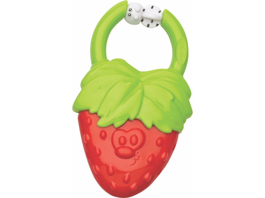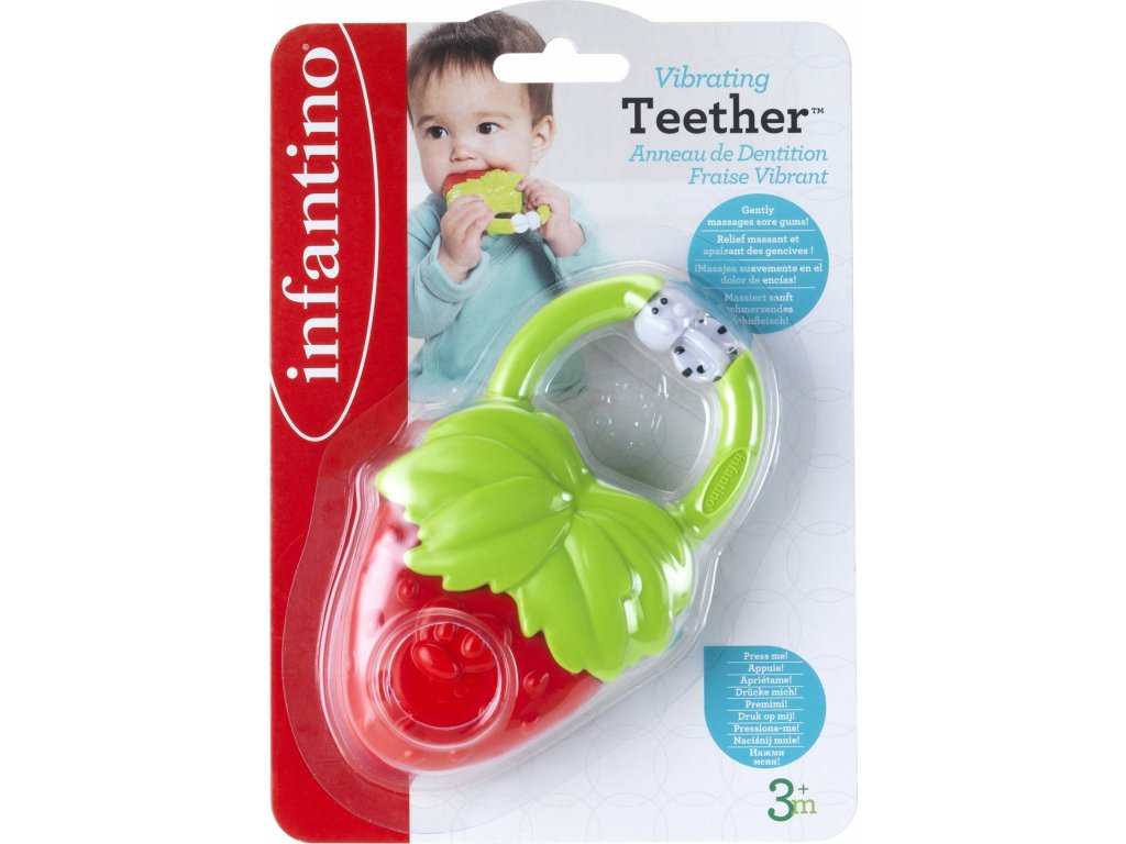 Kousátko s různorodými texturami pro zkoumání v ústech při zmáčknutí jemně vibruje a masíruje tak dítěti citlivé dásně při prořezávání prvních zoubků. Pohyblivá beruška na držadle kousátka nabízí další texturu pro zkoumání rukama i ústy.