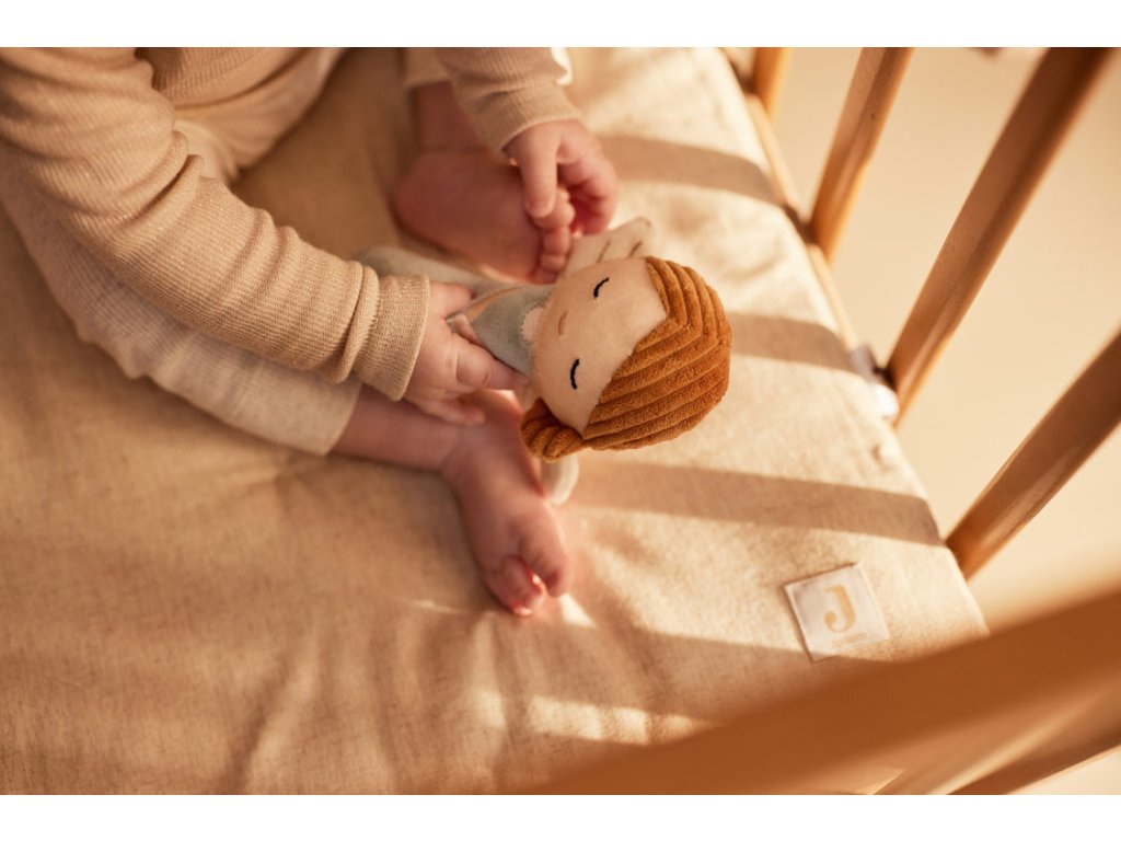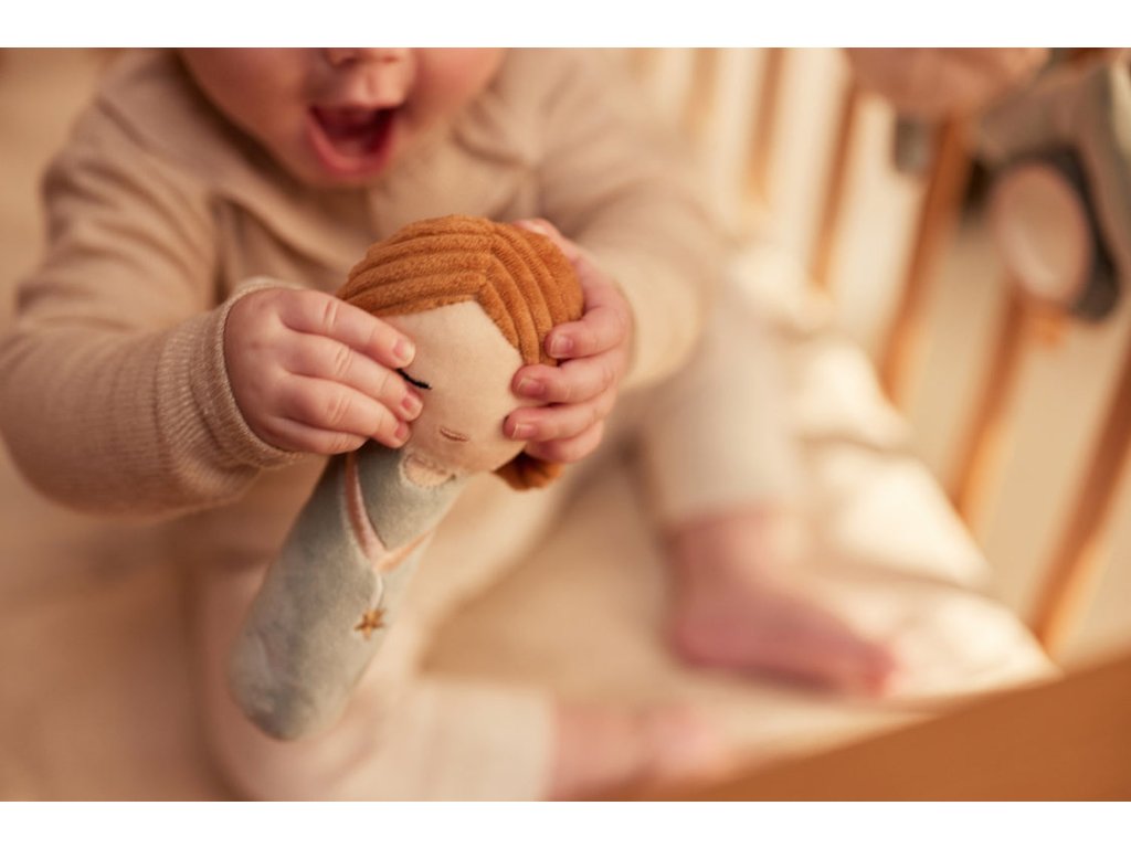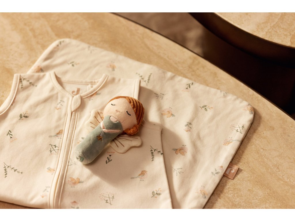 Chrastítko v podobě něžné víly z měkkého textilního materiálu má tvar pro snadné uchopení a při pohybu jemně chrastí.