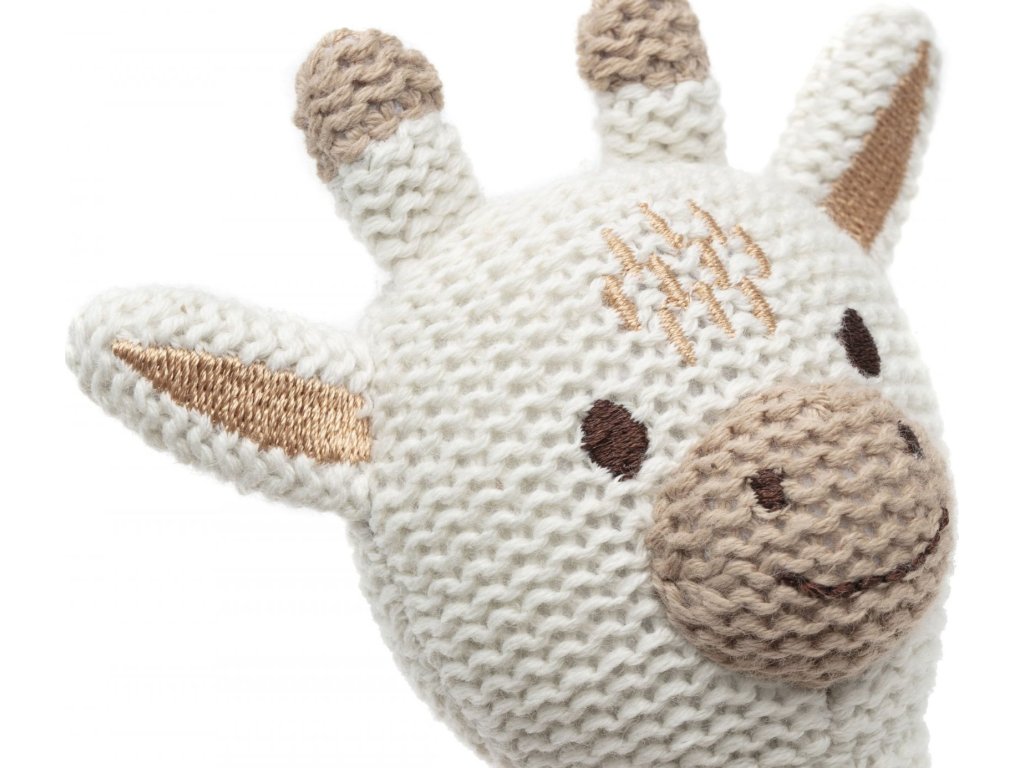 Chrastítko v podobě žirafy z měkkého bavlněného materiálu má tvar pro snadné uchopení a při pohybu jemně chrastí.