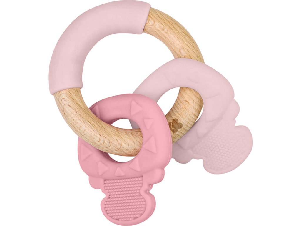 Kousátko KikkaBoo v podobě kroužku s klíči je vyrobené z bezpečného, jemného silikonu a bukového dřeva. Různorodé textury kousátka lákají dítě ke zkoumání v ústech a pomáhají při prořezávání jeho prvních zoubků. Tvar kousátka umožňuje jeho snadné uchopení malými dětskými ručičkami.