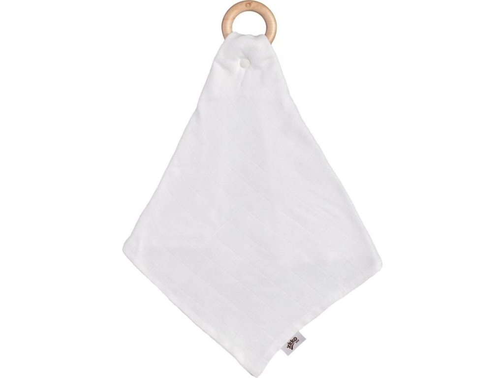 „Dřevěné kousátko XKKO BMB s plenkou z extrémně jemného bambusového mušelínu. Bambusová viskoza je antibakteriální a nezpůsobuje žádnou alergickou reakci. Velký, dokonale hladký kroužek je ručně vyrobený z javorového dřeva. Kroužek není barvený ani lakovaný.“