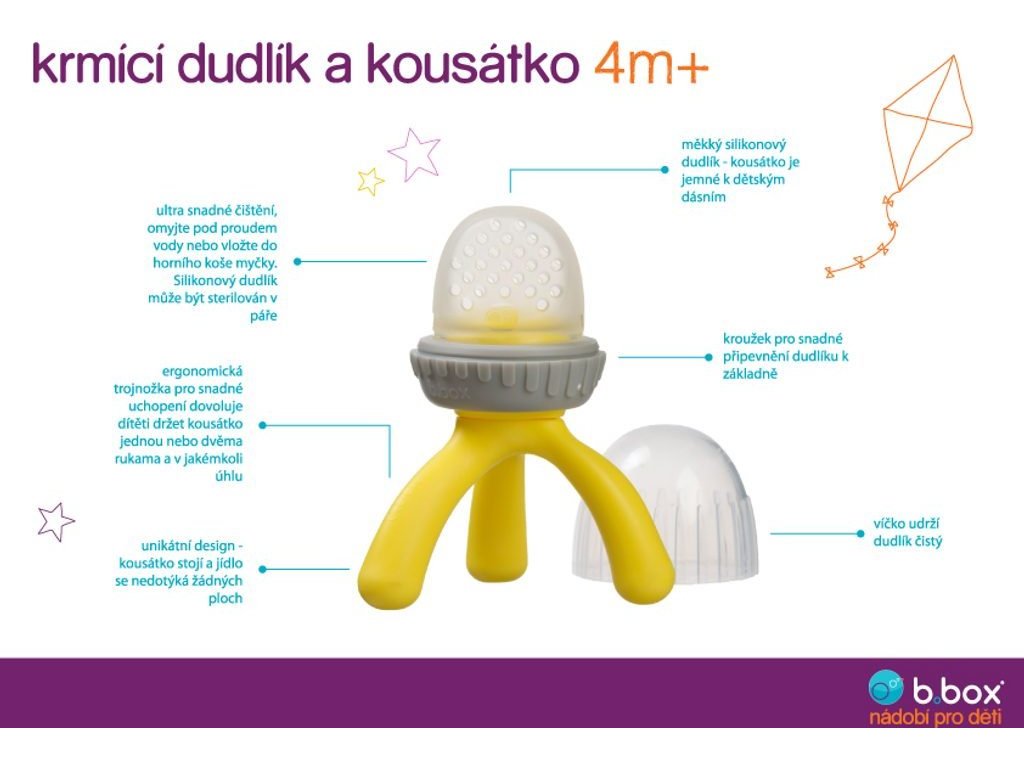 Krmící silikonová síťka oblíbené australské značky b.box, kterou snadno vyčistíte a je jemná k dětským dásním. Můžete ji mýt v myčce. Tato krmící síťka umožní vašim dětem samostatné krmení. Děti od čtyř měsíců věku mohou vychutnávat meloun, měkké ovoce, zeleninu a jiné dobroty. Jednoduše odšroubujte kroužek, naplňte silikonovou síťku a nechte děti objevovat nové chutě!