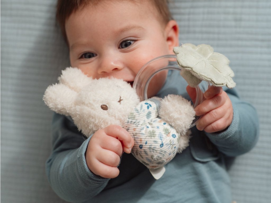 Roztomilý králíček z jemného plyše drží chrastítko s korálky, které vydává při pohybu jemný zvuk. Hračka podporuje rozvoj smyslů, zvídavosti a jemné motoriky dítěte.