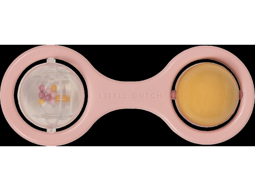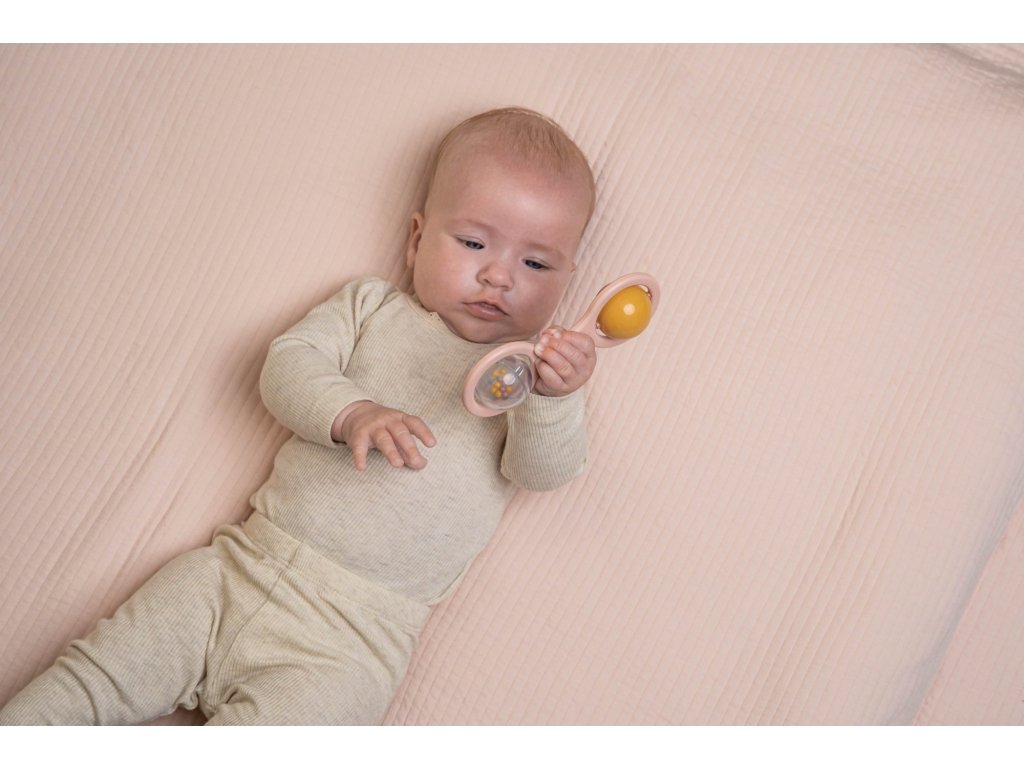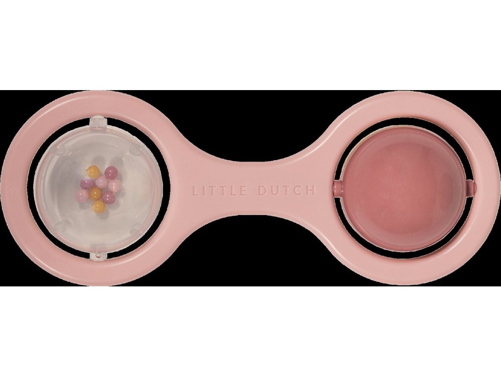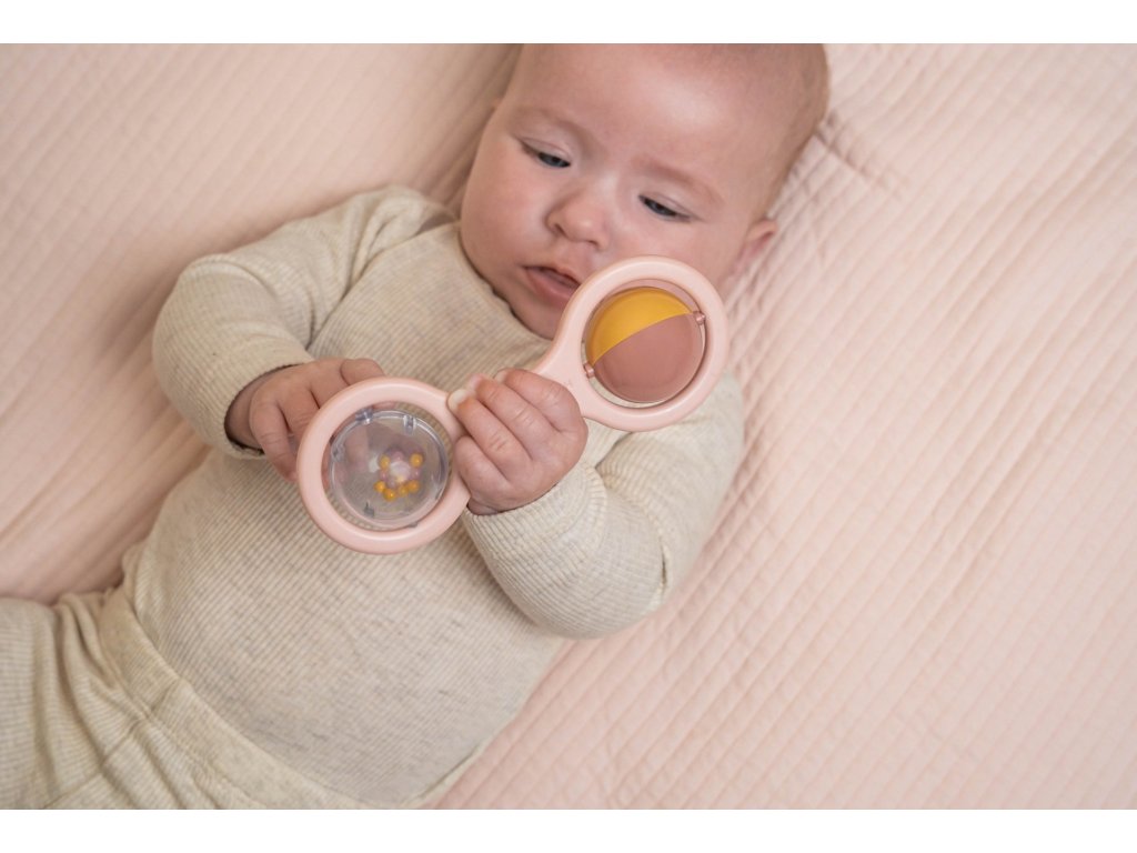 Chrastítko se dvěma otáčejícími se kuličkami je ideální jako první hračka pro vaše miminko. Pozornost dítěte upoutají chrasticí korálky v průhledné kuličce i střídající se barvy při otáčení dvoubarevné kuličky. Chrastítko má tvar pro snadné uchopení malými dětskými ručičkami.
