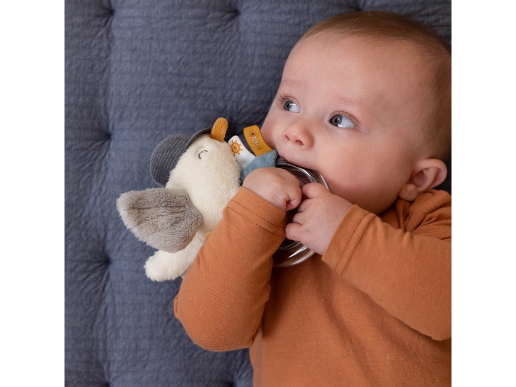 Originální chrastítko v podobě průhledného kroužku s chrasticími korálky a plyšovým rackem je ideální jako první hračka pro vaše miminko. Chrastítko má tvar pro snadné uchopení a různorodé textury pro zkoumání rukama i ústy. Křídla racka při zmáčknutí šustí.