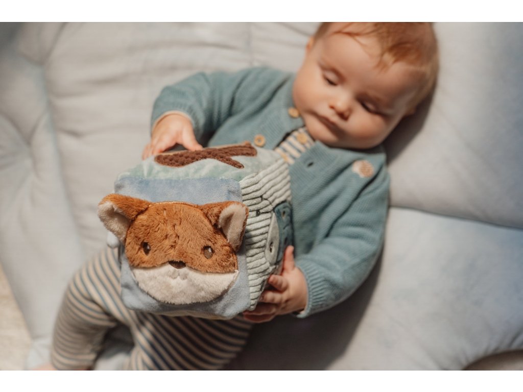 Měkká plyšová kostka s krásnými motivy ze života v lese je díky svému provedení snadno uchopitelná malými dětskými ručičkami. Různorodé textury, připevněné hračky a vyšívané ilustrace lákají dítě ke zkoumání, kostka navíc při pohybu jemně cinká.