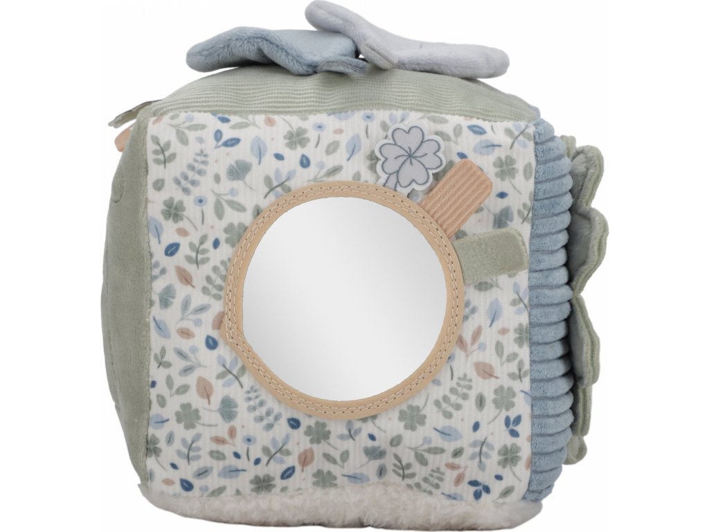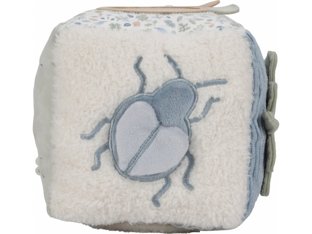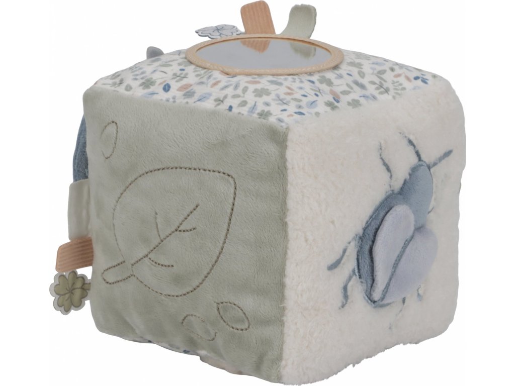 Měkká plyšová kostka je díky svému provedení snadno uchopitelná malými dětskými ručičkami. Různorodé textury, připevněné hračky a vyšívané ilustrace motivů ze života v lese lákají dítě ke zkoumání, kostka navíc při pohybu jemně cinká.