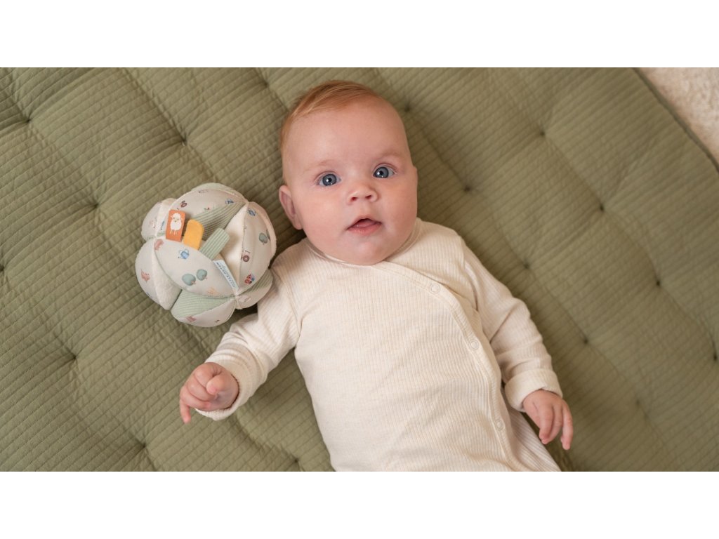 Měkký textilní míček je díky svému provedení snadno uchopenitelný malými dětskými ručičkami. Různorodé textury a vzory lákají dítě ke zkoumání, míček navíc při pohybu jemně cinká.